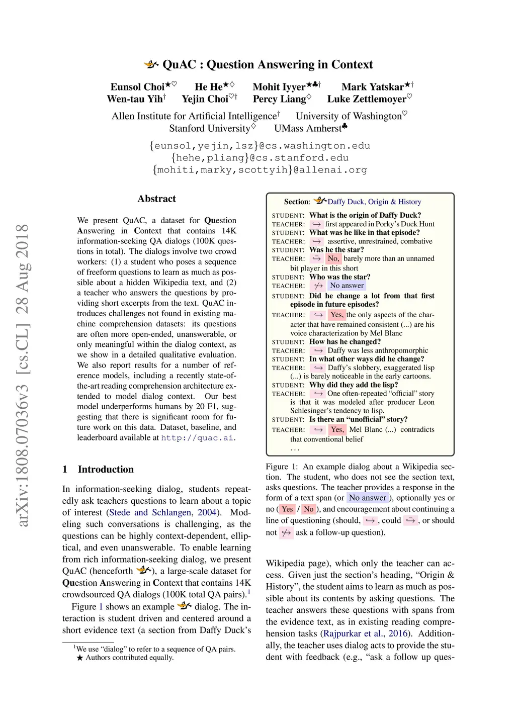 We present QuAC, a dataset for Question Answering in Context that contains 14K information-seeking QA dialogs (100K questions in total). The dialogs involve two crowd workers: (1) a student who poses a sequence of freeform questions to learn as much as possible about a hidden Wikipedia text, and (2) a teacher who answers the questions by providing short excerpts from the text. QuAC introduces challenges not found in existing machine comprehension datasets: its questions are often more open-ended, unanswerable, or only meaningful within the dialog context, as we show in a detailed qualitative evaluation. We also report results for a number of reference models, including a recently state-of-the-art reading comprehension architecture extended to model dialog context. Our best model underperforms humans by 20 F1, suggesting that there is significant room for future work on this data. Dataset, baseline, and leaderboard available at http://quac.ai.