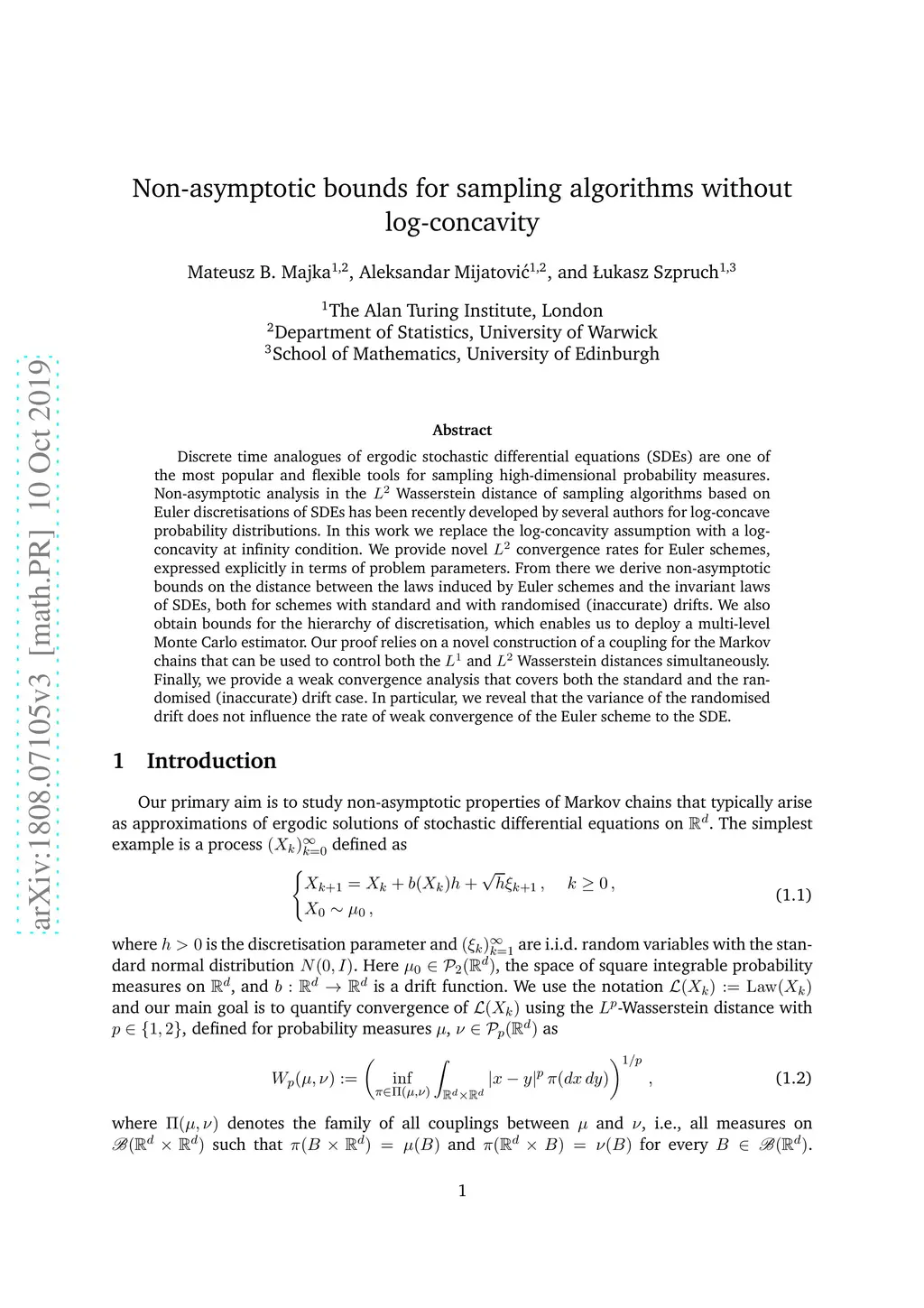 Discrete time analogues of ergodic stochastic differential equations (SDEs) are one of the most popular and flexible tools for sampling high-dimensional probability measures. Non-asymptotic analysis in the Wasserstein distance of sampling algorithms based on Euler discretisations of SDEs has been recently developed by several authors for log-concave probability distributions. In this work we replace the log-concavity assumption with a log-concavity at infinity condition. We provide novel convergence rates for Euler schemes, expressed explicitly in terms of problem parameters. From there we derive non-asymptotic bounds on the distance between the laws induced by Euler schemes and the invariant laws of SDEs, both for schemes with standard and with randomised (inaccurate) drifts. We also obtain bounds for the hierarchy of discretisation, which enables us to deploy a multi-level Monte Carlo estimator. Our proof relies on a novel construction of a coupling for the Markov chains that can be used to control both the and Wasserstein distances simultaneously. Finally, we provide a weak convergence analysis that covers both the standard and the randomised (inaccurate) drift case. In particular, we reveal that the variance of the randomised drift does not influence the rate of weak convergence of the Euler scheme to the SDE.