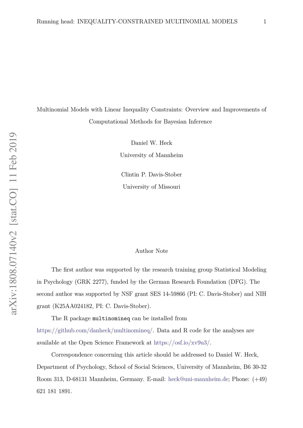 Many psychological theories can be operationalized as linear inequality constraints on the parameters of multinomial distributions (e.g., discrete choice analysis). These constraints can be described in two equivalent ways: Either as the solution set to a system of linear inequalities or as the convex hull of a set of extremal points (vertices). For both representations, we describe a general Gibbs sampler for drawing posterior samples in order to carry out Bayesian analyses. We also summarize alternative sampling methods for estimating Bayes factors for these model representations using the encompassing Bayes factor method. We introduce the R package multinomineq, which provides an easily-accessible interface to a computationally efficient implementation of these techniques.
