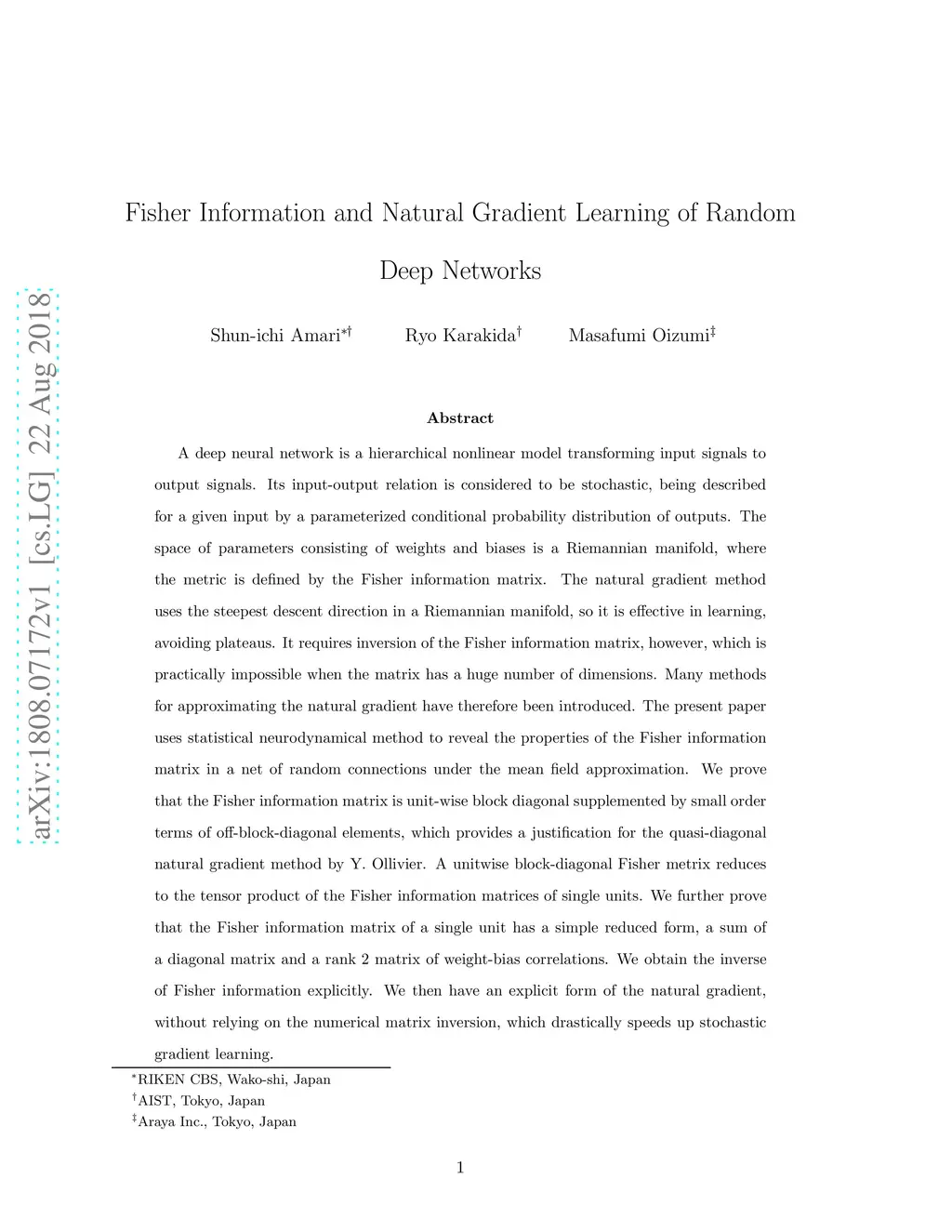 A deep neural network is a hierarchical nonlinear model transforming input signals to output signals. Its input-output relation is considered to be stochastic, being described for a given input by a parameterized conditional probability distribution of outputs. The space of parameters consisting of weights and biases is a Riemannian manifold, where the metric is defined by the Fisher information matrix. The natural gradient method uses the steepest descent direction in a Riemannian manifold, so it is effective in learning, avoiding plateaus. It requires inversion of the Fisher information matrix, however, which is practically impossible when the matrix has a huge number of dimensions. Many methods for approximating the natural gradient have therefore been introduced. The present paper uses statistical neurodynamical method to reveal the properties of the Fisher information matrix in a net of random connections under the mean field approximation. We prove that the Fisher information matrix is unit-wise block diagonal supplemented by small order terms of off-block-diagonal elements, which provides a justification for the quasi-diagonal natural gradient method by Y. Ollivier. A unitwise block-diagonal Fisher metrix reduces to the tensor product of the Fisher information matrices of single units. We further prove that the Fisher information matrix of a single unit has a simple reduced form, a sum of a diagonal matrix and a rank 2 matrix of weight-bias correlations. We obtain the inverse of Fisher information explicitly. We then have an explicit form of the natural gradient, without relying on the numerical matrix inversion, which drastically speeds up stochastic gradient learning.