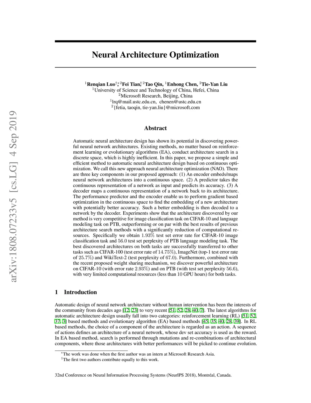 Automatic neural architecture design has shown its potential in discovering powerful neural network architectures. Existing methods, no matter based on reinforcement learning or evolutionary algorithms (EA), conduct architecture search in a discrete space, which is highly inefficient. In this paper, we propose a simple and efficient method to automatic neural architecture design based on continuous optimization. We call this new approach neural architecture optimization (NAO). There are three key components in our proposed approach: (1) An encoder embeds/maps neural network architectures into a continuous space. (2) A predictor takes the continuous representation of a network as input and predicts its accuracy. (3) A decoder maps a continuous representation of a network back to its architecture. The performance predictor and the encoder enable us to perform gradient based optimization in the continuous space to find the embedding of a new architecture with potentially better accuracy. Such a better embedding is then decoded to a network by the decoder. Experiments show that the architecture discovered by our method is very competitive for image classification task on CIFAR-10 and language modeling task on PTB, outperforming or on par with the best results of previous architecture search methods with a significantly reduction of computational resources. Specifically we obtain 1.93% test set error rate for CIFAR-10 image classification task and 56.0 test set perplexity of PTB language modeling task. Furthermore, combined with the recent proposed weight sharing mechanism, we discover powerful architecture on CIFAR-10 (with error rate 2.93%) and on PTB (with test set perplexity 56.6), with very limited computational resources (less than 10 GPU hours) for both tasks.