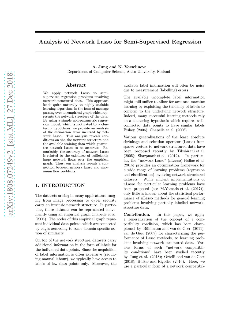 We apply network Lasso to semi-supervised regression problems involving network structured data. This approach lends quite naturally to highly scalable learning algorithms in the form of message passing over an empirical graph which represents the network structure of the data. By using a simple non-parametric regression model, which is motivated by a clustering hypothesis, we provide an analysis of the estimation error incurred by network Lasso. This analysis reveals conditions on the the network structure and the available training data which guarantee network Lasso to be accurate. Remarkably, the accuracy of network Lasso is related to the existence of sufficiently large network flows over the empirical graph. Thus, our analysis reveals a connection between network Lasso and maximum flow problems.