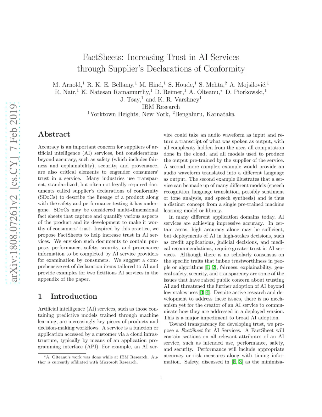 Accuracy is an important concern for suppliers of artificial intelligence (AI) services, but considerations beyond accuracy, such as safety (which includes fairness and explainability), security, and provenance, are also critical elements to engender consumers' trust in a service. Many industries use transparent, standardized, but often not legally required documents called supplier's declarations of conformity (SDoCs) to describe the lineage of a product along with the safety and performance testing it has undergone. SDoCs may be considered multi-dimensional fact sheets that capture and quantify various aspects of the product and its development to make it worthy of consumers' trust. Inspired by this practice, we propose FactSheets to help increase trust in AI services. We envision such documents to contain purpose, performance, safety, security, and provenance information to be completed by AI service providers for examination by consumers. We suggest a comprehensive set of declaration items tailored to AI and provide examples for two fictitious AI services in the appendix of the paper.