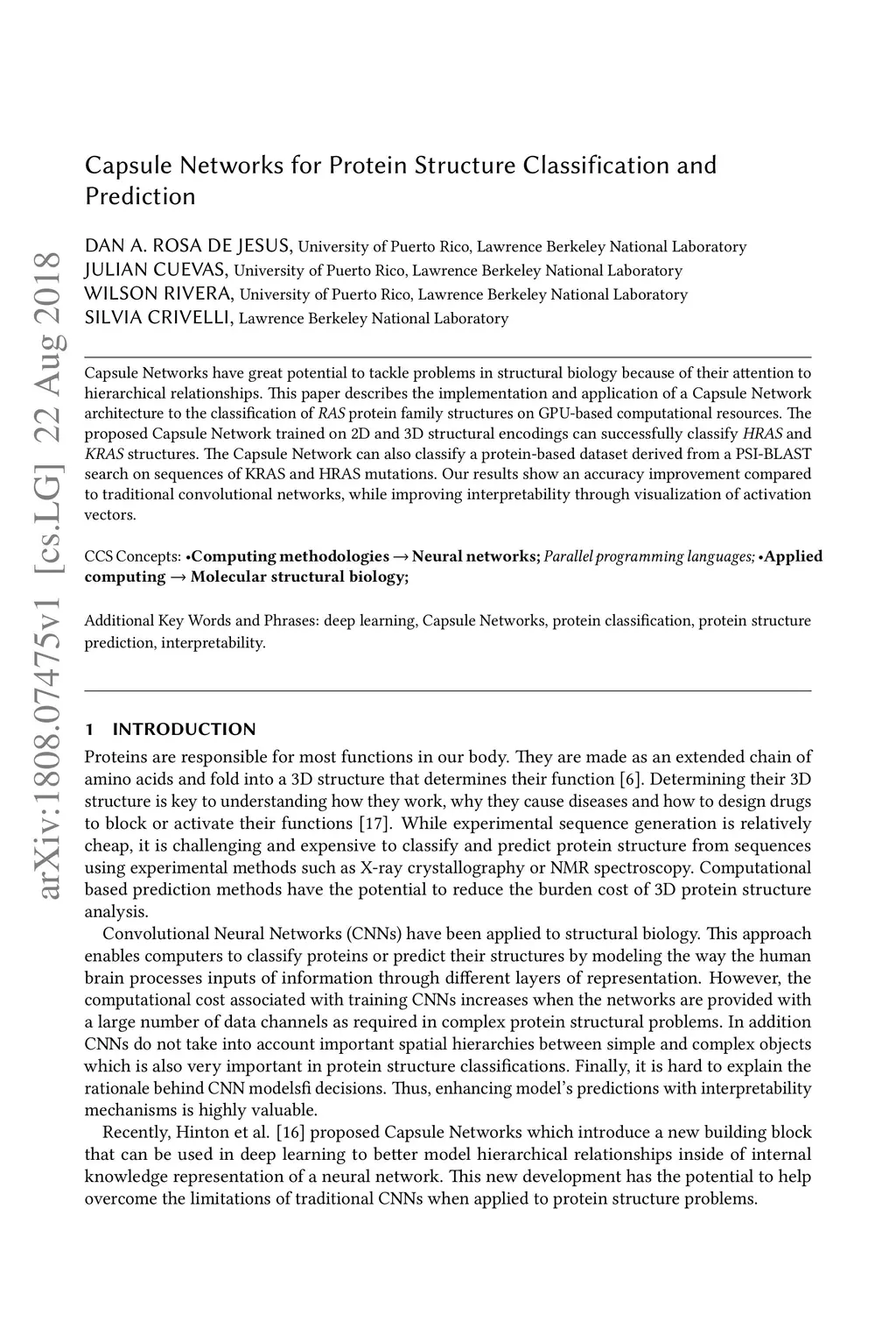 Capsule Networks have great potential to tackle problems in structural biology because of their attention to hierarchical relationships. This paper describes the implementation and application of a Capsule Network architecture to the classification of RAS protein family structures on GPU-based computational resources. The proposed Capsule Network trained on 2D and 3D structural encodings can successfully classify HRAS and KRAS structures. The Capsule Network can also classify a protein-based dataset derived from a PSI-BLAST search on sequences of KRAS and HRAS mutations. Our results show an accuracy improvement compared to traditional convolutional networks, while improving interpretability through visualization of activation vectors.