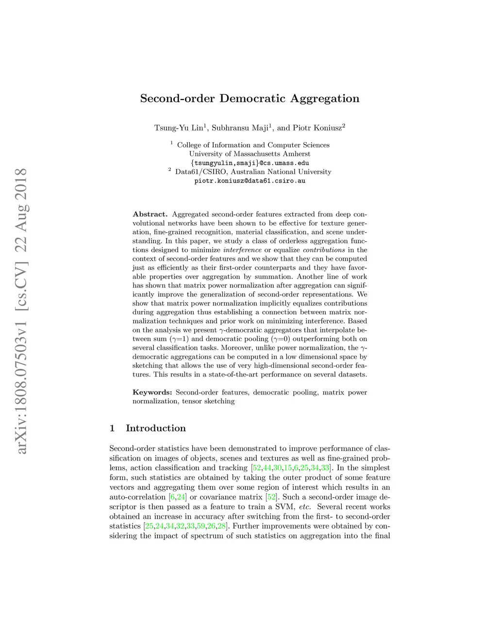 Aggregated second-order features extracted from deep convolutional networks have been shown to be effective for texture generation, fine-grained recognition, material classification, and scene understanding. In this paper, we study a class of orderless aggregation functions designed to minimize interference or equalize contributions in the context of second-order features and we show that they can be computed just as efficiently as their first-order counterparts and they have favorable properties over aggregation by summation. Another line of work has shown that matrix power normalization after aggregation can significantly improve the generalization of second-order representations. We show that matrix power normalization implicitly equalizes contributions during aggregation thus establishing a connection between matrix normalization techniques and prior work on minimizing interference. Based on the analysis we present {\gamma}-democratic aggregators that interpolate between sum ({\gamma}=1) and democratic pooling ({\gamma}=0) outperforming both on several classification tasks. Moreover, unlike power normalization, the {\gamma}-democratic aggregations can be computed in a low dimensional space by sketching that allows the use of very high-dimensional second-order features. This results in a state-of-the-art performance on several datasets.