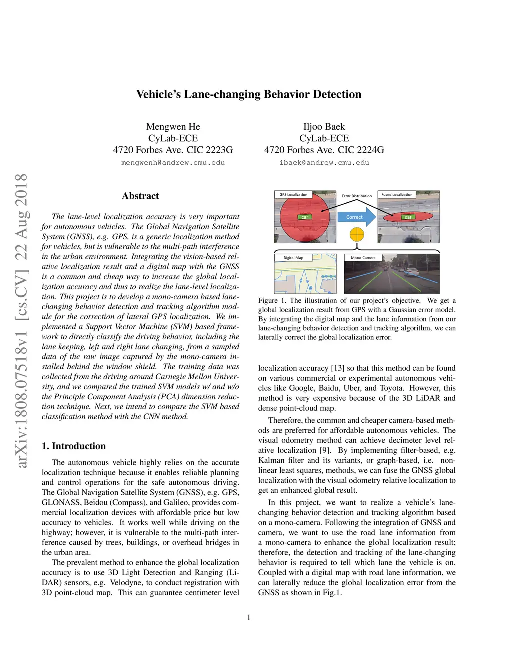 The lane-level localization accuracy is very important for autonomous vehicles. The Global Navigation Satellite System (GNSS), e.g. GPS, is a generic localization method for vehicles, but is vulnerable to the multi-path interference in the urban environment. Integrating the vision-based relative localization result and a digital map with the GNSS is a common and cheap way to increase the global localization accuracy and thus to realize the lane-level localization. This project is to develop a mono-camera based lane-changing behavior detection module for the correction of lateral GPS localization. We implemented a Support Vector Machine (SVM) based framework to directly classify the driving behavior, including the lane keeping, left and right lane changing, from a sampled data of the raw image captured by the mono-camera installed behind the window shield. The training data was collected from the driving around Carnegie Mellon University, and we compared the trained SVM models w/ and w/o the Principle Component Analysis (PCA) dimension reduction technique. The performance of the SVM based classification method was compared with the CNN method.
