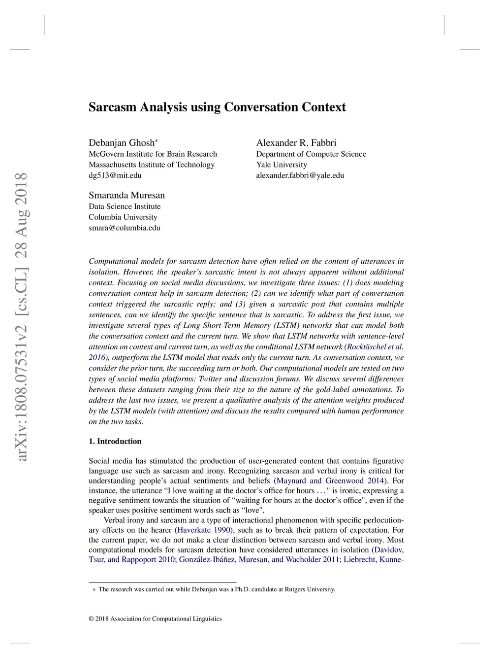 Computational models for sarcasm detection have often relied on the content of utterances in isolation. However, the speaker's sarcastic intent is not always apparent without additional context. Focusing on social media discussions, we investigate three issues: (1) does modeling conversation context help in sarcasm detection; (2) can we identify what part of conversation context triggered the sarcastic reply; and (3) given a sarcastic post that contains multiple sentences, can we identify the specific sentence that is sarcastic. To address the first issue, we investigate several types of Long Short-Term Memory (LSTM) networks that can model both the conversation context and the current turn. We show that LSTM networks with sentence-level attention on context and current turn, as well as the conditional LSTM network (Rocktaschel et al. 2016), outperform the LSTM model that reads only the current turn. As conversation context, we consider the prior turn, the succeeding turn or both. Our computational models are tested on two types of social media platforms: Twitter and discussion forums. We discuss several differences between these datasets ranging from their size to the nature of the gold-label annotations. To address the last two issues, we present a qualitative analysis of attention weights produced by the LSTM models (with attention) and discuss the results compared with human performance on the task.