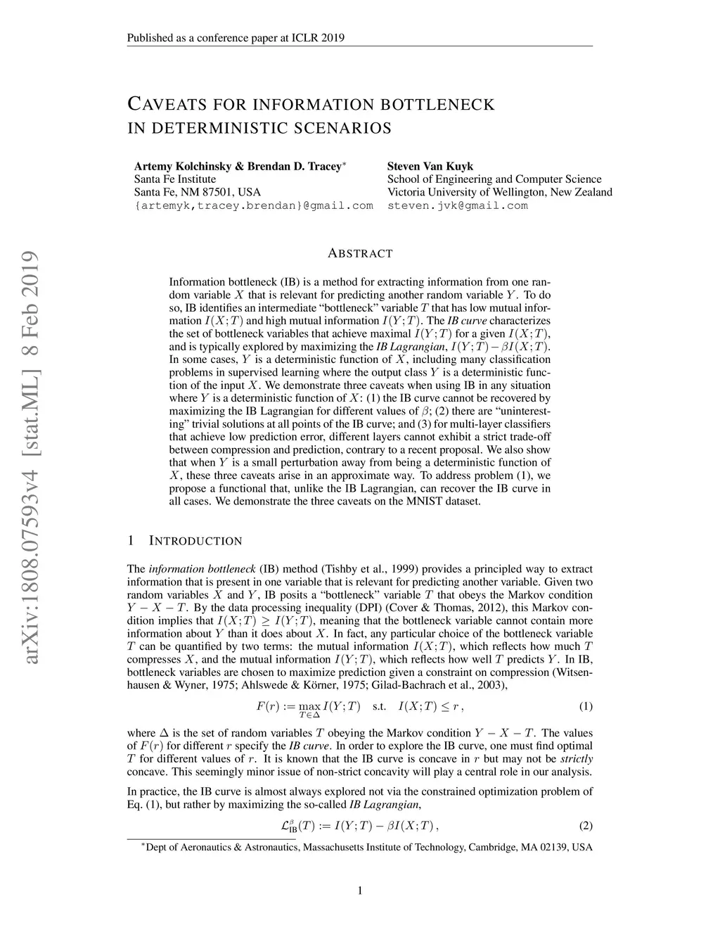 Information bottleneck (IB) is a method for extracting information from one random variable that is relevant for predicting another random variable . To do so, IB identifies an intermediate "bottleneck" variable that has low mutual information and high mutual information . The "IB curve" characterizes the set of bottleneck variables that achieve maximal for a given , and is typically explored by maximizing the "IB Lagrangian", . In some cases, is a deterministic function of , including many classification problems in supervised learning where the output class is a deterministic function of the input . We demonstrate three caveats when using IB in any situation where is a deterministic function of : (1) the IB curve cannot be recovered by maximizing the IB Lagrangian for different values of ; (2) there are "uninteresting" trivial solutions at all points of the IB curve; and (3) for multi-layer classifiers that achieve low prediction error, different layers cannot exhibit a strict trade-off between compression and prediction, contrary to a recent proposal. We also show that when is a small perturbation away from being a deterministic function of , these three caveats arise in an approximate way. To address problem (1), we propose a functional that, unlike the IB Lagrangian, can recover the IB curve in all cases. We demonstrate the three caveats on the MNIST dataset.