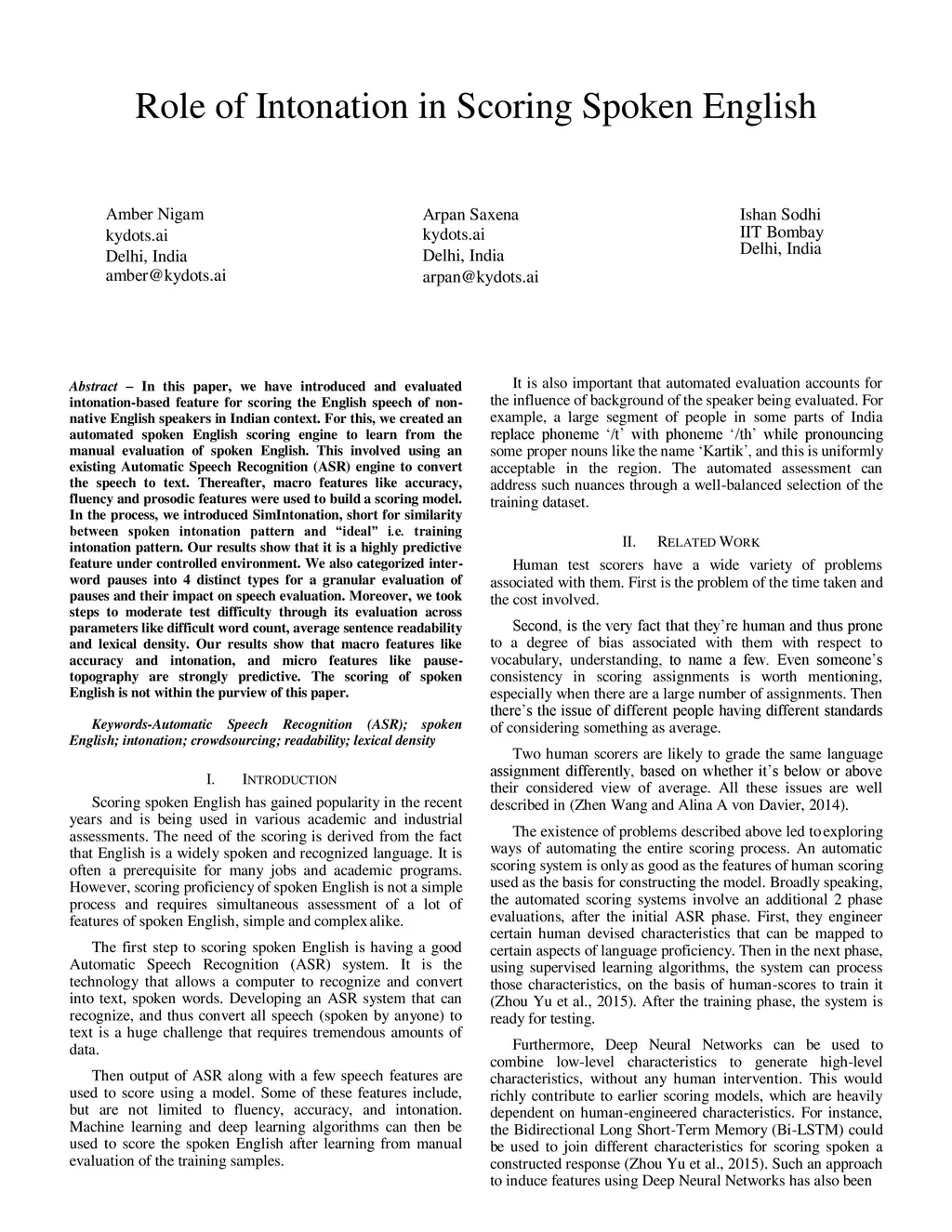 In this paper, we have introduced and evaluated intonation based feature for scoring the English speech of nonnative English speakers in Indian context. For this, we created an automated spoken English scoring engine to learn from the manual evaluation of spoken English. This involved using an existing Automatic Speech Recognition (ASR) engine to convert the speech to text. Thereafter, macro features like accuracy, fluency and prosodic features were used to build a scoring model. In the process, we introduced SimIntonation, short for similarity between spoken intonation pattern and "ideal" i.e. training intonation pattern. Our results show that it is a highly predictive feature under controlled environment. We also categorized interword pauses into 4 distinct types for a granular evaluation of pauses and their impact on speech evaluation. Moreover, we took steps to moderate test difficulty through its evaluation across parameters like difficult word count, average sentence readability and lexical density. Our results show that macro features like accuracy and intonation, and micro features like pause-topography are strongly predictive. The scoring of spoken English is not within the purview of this paper.