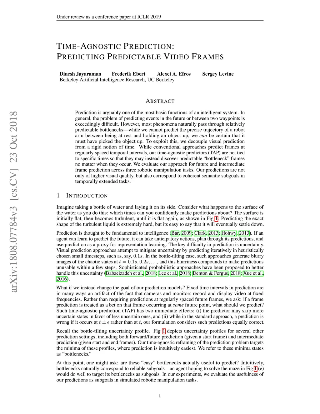 Prediction is arguably one of the most basic functions of an intelligent system. In general, the problem of predicting events in the future or between two waypoints is exceedingly difficult. However, most phenomena naturally pass through relatively predictable bottlenecks---while we cannot predict the precise trajectory of a robot arm between being at rest and holding an object up, we can be certain that it must have picked the object up. To exploit this, we decouple visual prediction from a rigid notion of time. While conventional approaches predict frames at regularly spaced temporal intervals, our time-agnostic predictors (TAP) are not tied to specific times so that they may instead discover predictable "bottleneck" frames no matter when they occur. We evaluate our approach for future and intermediate frame prediction across three robotic manipulation tasks. Our predictions are not only of higher visual quality, but also correspond to coherent semantic subgoals in temporally extended tasks.