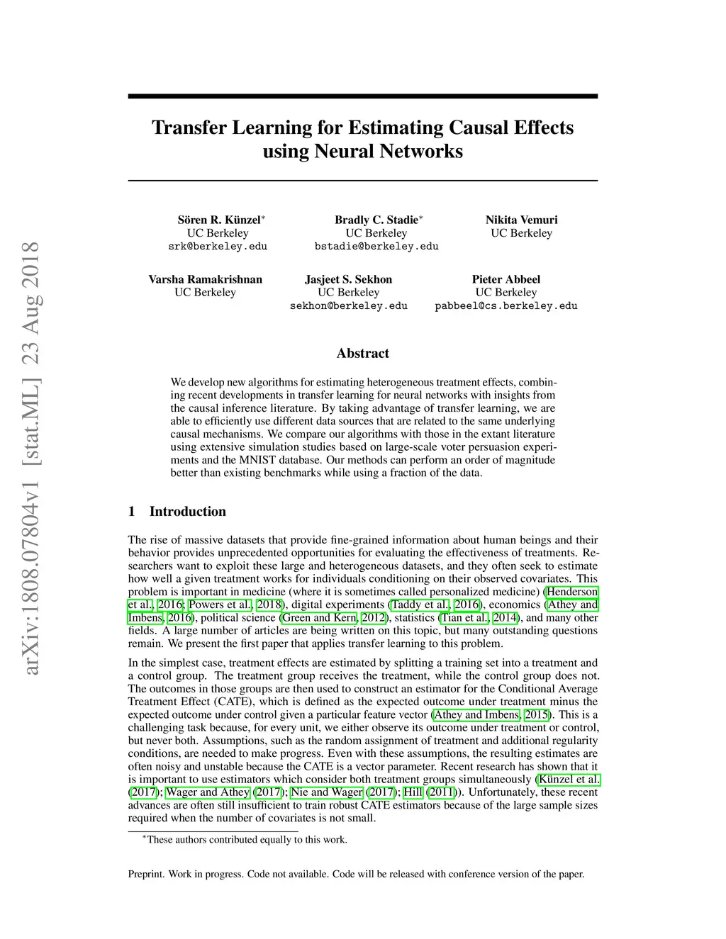 We develop new algorithms for estimating heterogeneous treatment effects, combining recent developments in transfer learning for neural networks with insights from the causal inference literature. By taking advantage of transfer learning, we are able to efficiently use different data sources that are related to the same underlying causal mechanisms. We compare our algorithms with those in the extant literature using extensive simulation studies based on large-scale voter persuasion experiments and the MNIST database. Our methods can perform an order of magnitude better than existing benchmarks while using a fraction of the data.