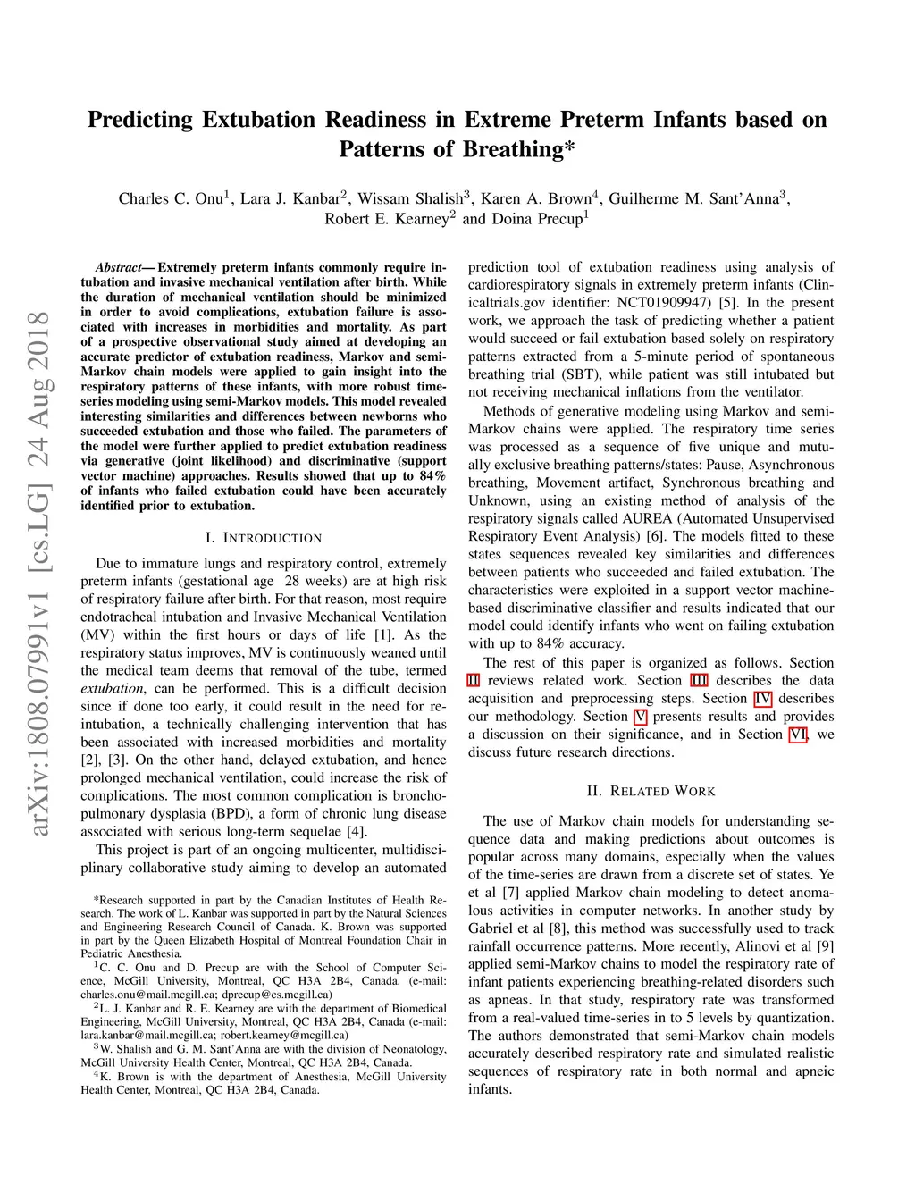 Extremely preterm infants commonly require intubation and invasive mechanical ventilation after birth. While the duration of mechanical ventilation should be minimized in order to avoid complications, extubation failure is associated with increases in morbidities and mortality. As part of a prospective observational study aimed at developing an accurate predictor of extubation readiness, Markov and semi-Markov chain models were applied to gain insight into the respiratory patterns of these infants, with more robust time-series modeling using semi-Markov models. This model revealed interesting similarities and differences between newborns who succeeded extubation and those who failed. The parameters of the model were further applied to predict extubation readiness via generative (joint likelihood) and discriminative (support vector machine) approaches. Results showed that up to 84\% of infants who failed extubation could have been accurately identified prior to extubation.