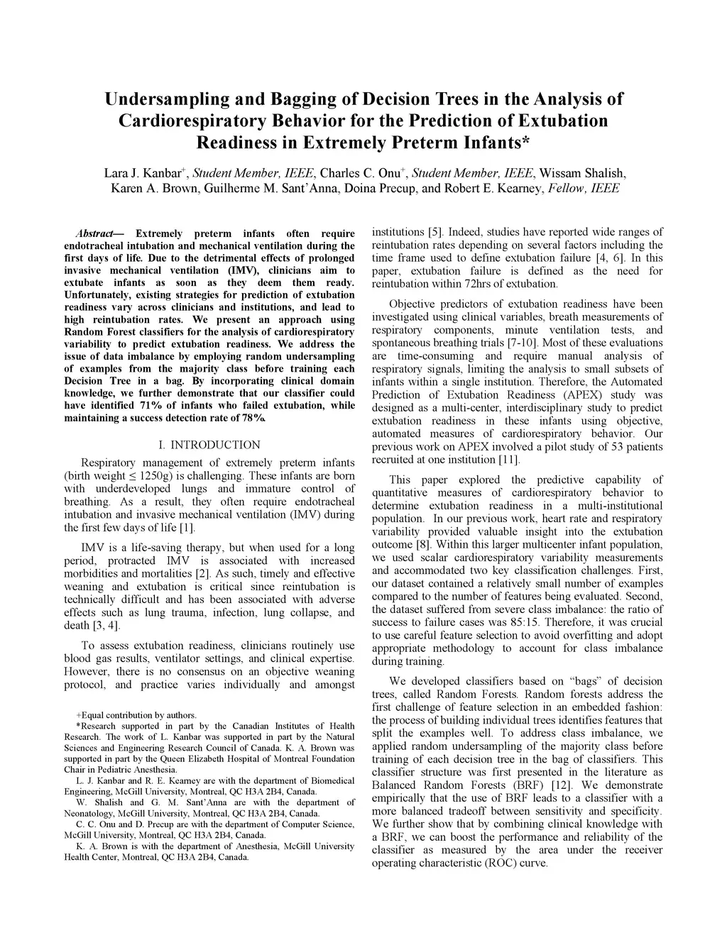 Extremely preterm infants often require endotracheal intubation and mechanical ventilation during the first days of life. Due to the detrimental effects of prolonged invasive mechanical ventilation (IMV), clinicians aim to extubate infants as soon as they deem them ready. Unfortunately, existing strategies for prediction of extubation readiness vary across clinicians and institutions, and lead to high reintubation rates. We present an approach using Random Forest classifiers for the analysis of cardiorespiratory variability to predict extubation readiness. We address the issue of data imbalance by employing random undersampling of examples from the majority class before training each Decision Tree in a bag. By incorporating clinical domain knowledge, we further demonstrate that our classifier could have identified 71% of infants who failed extubation, while maintaining a success detection rate of 78%.