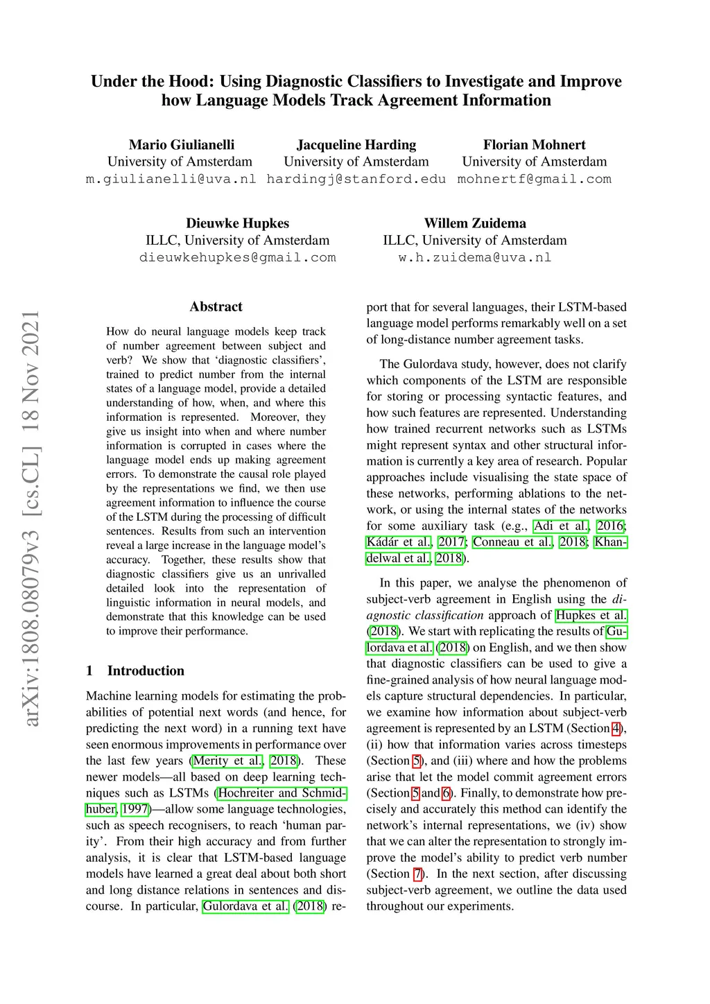 How do neural language models keep track of number agreement between subject and verb? We show that `diagnostic classifiers', trained to predict number from the internal states of a language model, provide a detailed understanding of how, when, and where this information is represented. Moreover, they give us insight into when and where number information is corrupted in cases where the language model ends up making agreement errors. To demonstrate the causal role played by the representations we find, we then use agreement information to influence the course of the LSTM during the processing of difficult sentences. Results from such an intervention reveal a large increase in the language model's accuracy. Together, these results show that diagnostic classifiers give us an unrivalled detailed look into the representation of linguistic information in neural models, and demonstrate that this knowledge can be used to improve their performance.