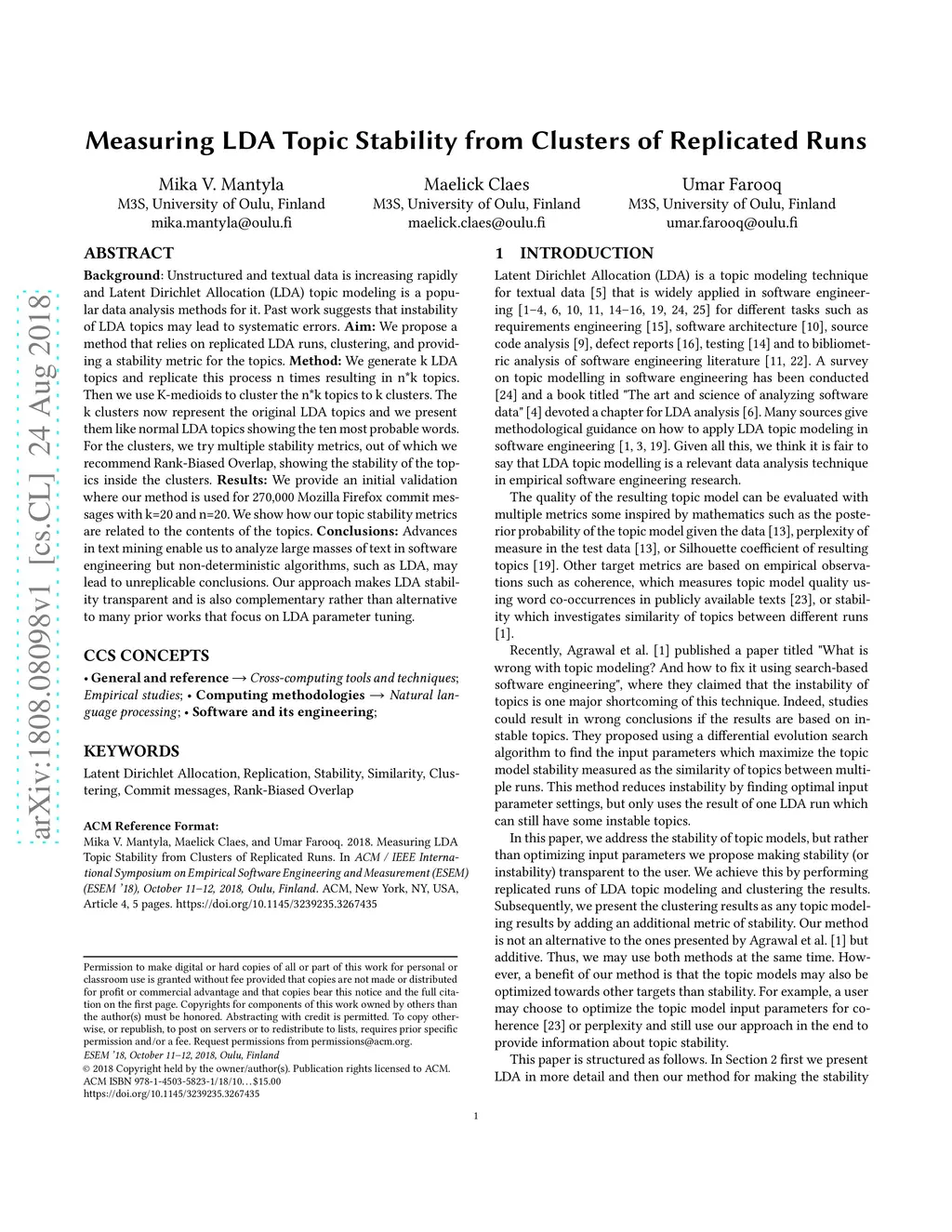 Background: Unstructured and textual data is increasing rapidly and Latent Dirichlet Allocation (LDA) topic modeling is a popular data analysis methods for it. Past work suggests that instability of LDA topics may lead to systematic errors. Aim: We propose a method that relies on replicated LDA runs, clustering, and providing a stability metric for the topics. Method: We generate k LDA topics and replicate this process n times resulting in n*k topics. Then we use K-medioids to cluster the n*k topics to k clusters. The k clusters now represent the original LDA topics and we present them like normal LDA topics showing the ten most probable words. For the clusters, we try multiple stability metrics, out of which we recommend Rank-Biased Overlap, showing the stability of the topics inside the clusters. Results: We provide an initial validation where our method is used for 270,000 Mozilla Firefox commit messages with k=20 and n=20. We show how our topic stability metrics are related to the contents of the topics. Conclusions: Advances in text mining enable us to analyze large masses of text in software engineering but non-deterministic algorithms, such as LDA, may lead to unreplicable conclusions. Our approach makes LDA stability transparent and is also complementary rather than alternative to many prior works that focus on LDA parameter tuning.