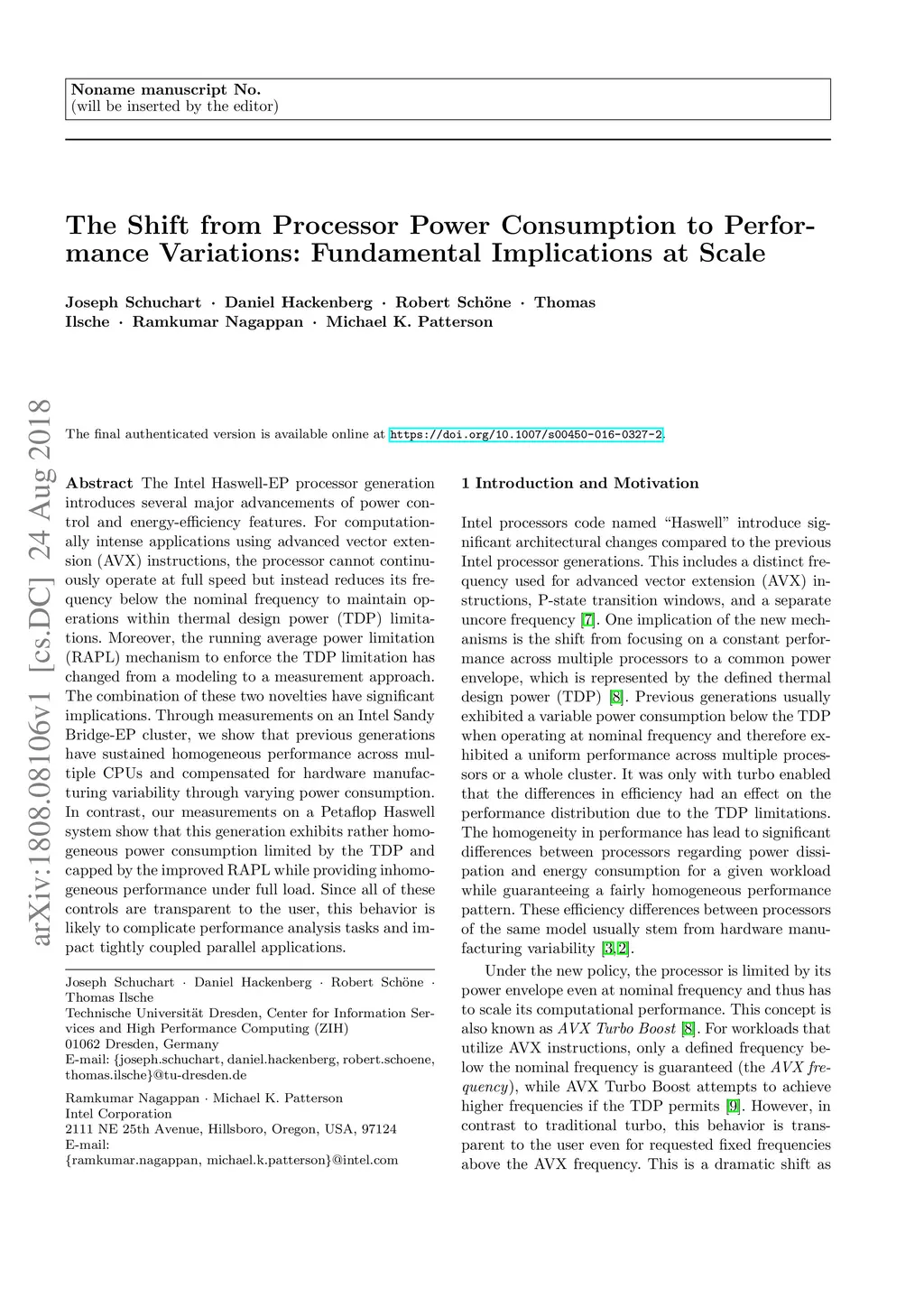 The Intel Haswell-EP processor generation introduces several major advancements of power control and energy-efficiency features. For computationally intense applications using advanced vector extension (AVX) instructions, the processor cannot continuously operate at full speed but instead reduces its frequency below the nominal frequency to maintain operations within thermal design power (TDP) limitations. Moreover, the running average power limitation (RAPL) mechanism to enforce the TDP limitation has changed from a modeling to a measurement approach. The combination of these two novelties have significant implications. Through measurements on an Intel Sandy Bridge-EP cluster, we show that previous generations have sustained homogeneous performance across multiple CPUs and compensated for hardware manufacturing variability through varying power consumption. In contrast, our measurements on a Petaflop Haswell system show that this generation exhibits rather homogeneous power consumption limited by the TDP and capped by the improved RAPL while providing inhomogeneous performance under full load. Since all of these controls are transparent to the user, this behavior is likely to complicate performance analysis tasks and impact tightly coupled parallel applications.