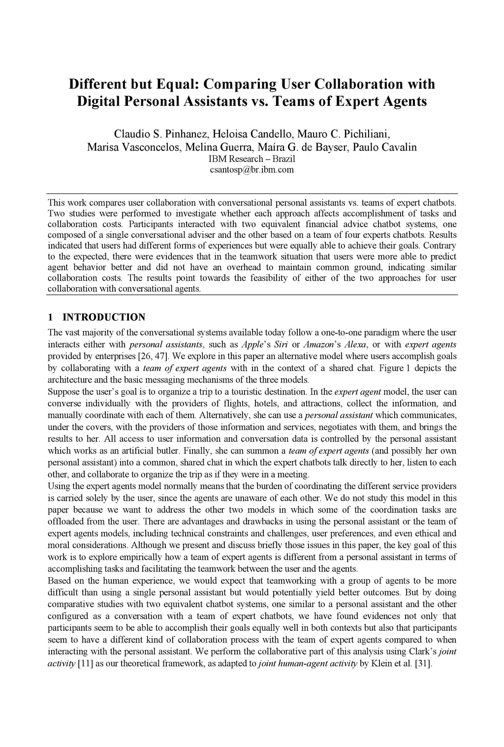 This work compares user collaboration with conversational personal assistants vs. teams of expert chatbots. Two studies were performed to investigate whether each approach affects accomplishment of tasks and collaboration costs. Participants interacted with two equivalent financial advice chatbot systems, one composed of a single conversational adviser and the other based on a team of four experts chatbots. Results indicated that users had different forms of experiences but were equally able to achieve their goals. Contrary to the expected, there were evidences that in the teamwork situation that users were more able to predict agent behavior better and did not have an overhead to maintain common ground, indicating similar collaboration costs. The results point towards the feasibility of either of the two approaches for user collaboration with conversational agents.