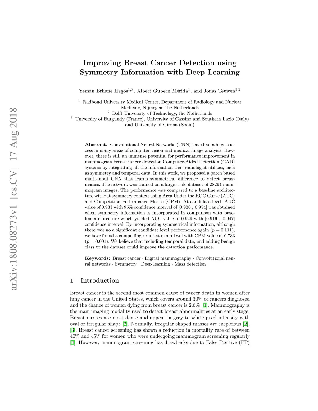 Improving Breast Cancer Detection using Symmetry Information with Deep