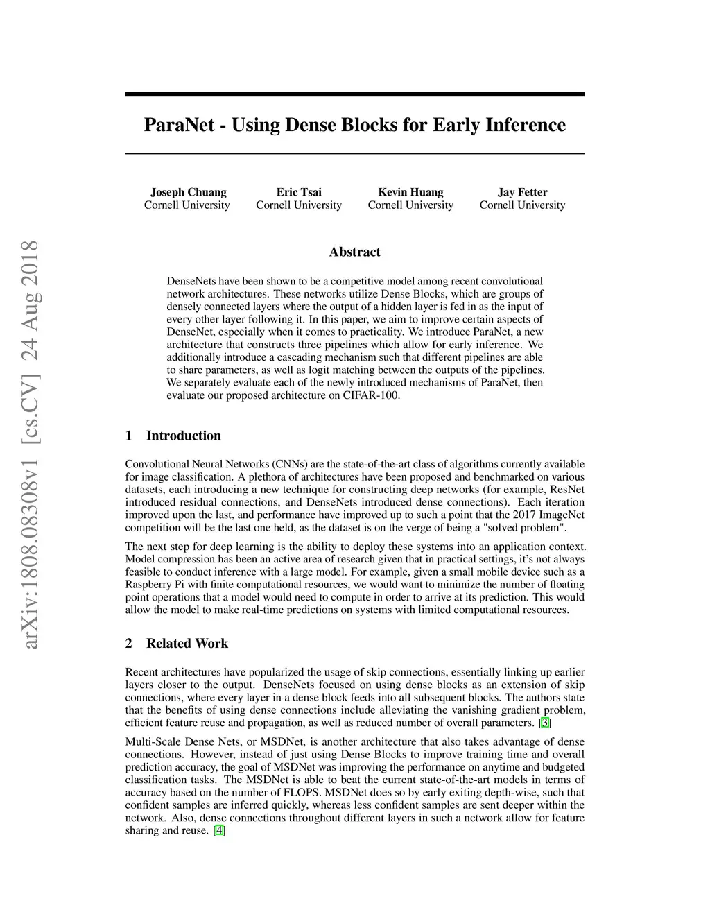 DenseNets have been shown to be a competitive model among recent convolutional network architectures. These networks utilize Dense Blocks, which are groups of densely connected layers where the output of a hidden layer is fed in as the input of every other layer following it. In this paper, we aim to improve certain aspects of DenseNet, especially when it comes to practicality. We introduce ParaNet, a new architecture that constructs three pipelines which allow for early inference. We additionally introduce a cascading mechanism such that different pipelines are able to share parameters, as well as logit matching between the outputs of the pipelines. We separately evaluate each of the newly introduced mechanisms of ParaNet, then evaluate our proposed architecture on CIFAR-100.