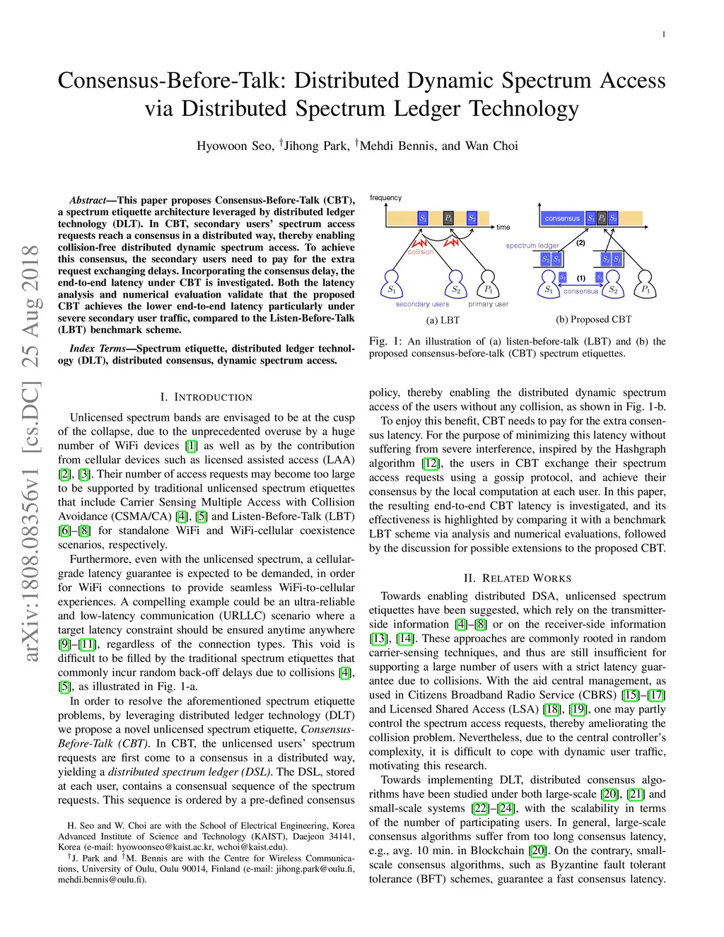 This paper proposes Consensus-Before-Talk (CBT), a spectrum etiquette architecture leveraged by distributed ledger technology (DLT). In CBT, secondary users' spectrum access requests reach a consensus in a distributed way, thereby enabling collision-free distributed dynamic spectrum access. To achieve this consensus, the secondary users need to pay for the extra request exchanging delays. Incorporating the consensus delay, the end-to-end latency under CBT is investigated. Both the latency analysis and numerical evaluation validate that the proposed CBT achieves the lower end-to-end latency particularly under severe secondary user traffic, compared to the Listen-Before-Talk (LBT) benchmark scheme.