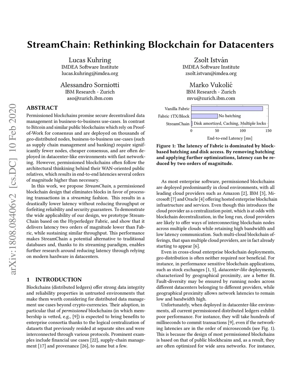Permissioned blockchains promise secure decentralized data management in business-to-business use-cases. In contrast to Bitcoin and similar public blockchains which rely on Proof-of-Work for consensus and are deployed on thousands of geo-distributed nodes, business-to-business use-cases (such as supply chain management and banking) require significantly fewer nodes, cheaper consensus, and are often deployed in datacenter-like environments with fast networking. However, permissioned blockchains often follow the architectural thinkining behind their WAN-oriented public relatives, which results in end-to-end latencies several orders of magnitude higher than necessary. In this work, we propose StreamChain, a permissioned blockchain design that eliminates blocks in favor of processing transactions in a streaming fashion. This results in a drastically lower latency without reducing throughput or forfeiting reliability and security guarantees. To demonstrate the wide applicability of our design, we prototype StreamChain based on the Hyperledger Fabric, and show that it delivers latency two orders of magnitude lower than Fabric, while sustaining similar throughput. This performance makes StreamChain a potential alternative to traditional databases and, thanks to its streaming paradigm, enables further research around reducing latency through relying on modern hardware in datacenters.