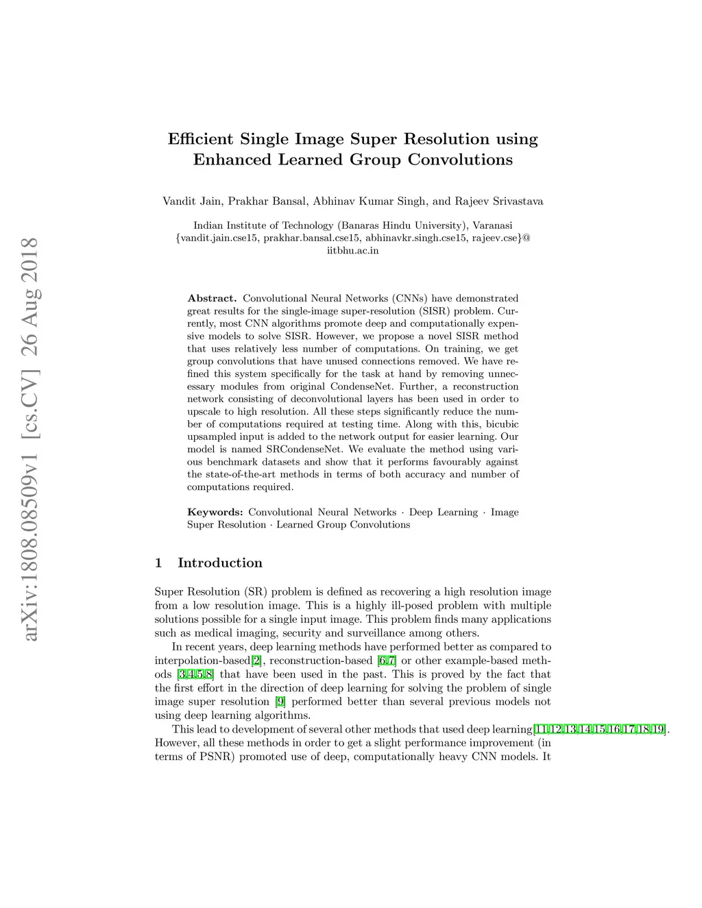 Convolutional Neural Networks (CNNs) have demonstrated great results for the single-image super-resolution (SISR) problem. Currently, most CNN algorithms promote deep and computationally expensive models to solve SISR. However, we propose a novel SISR method that uses relatively less number of computations. On training, we get group convolutions that have unused connections removed. We have refined this system specifically for the task at hand by removing unnecessary modules from original CondenseNet. Further, a reconstruction network consisting of deconvolutional layers has been used in order to upscale to high resolution. All these steps significantly reduce the number of computations required at testing time. Along with this, bicubic upsampled input is added to the network output for easier learning. Our model is named SRCondenseNet. We evaluate the method using various benchmark datasets and show that it performs favourably against the state-of-the-art methods in terms of both accuracy and number of computations required.
