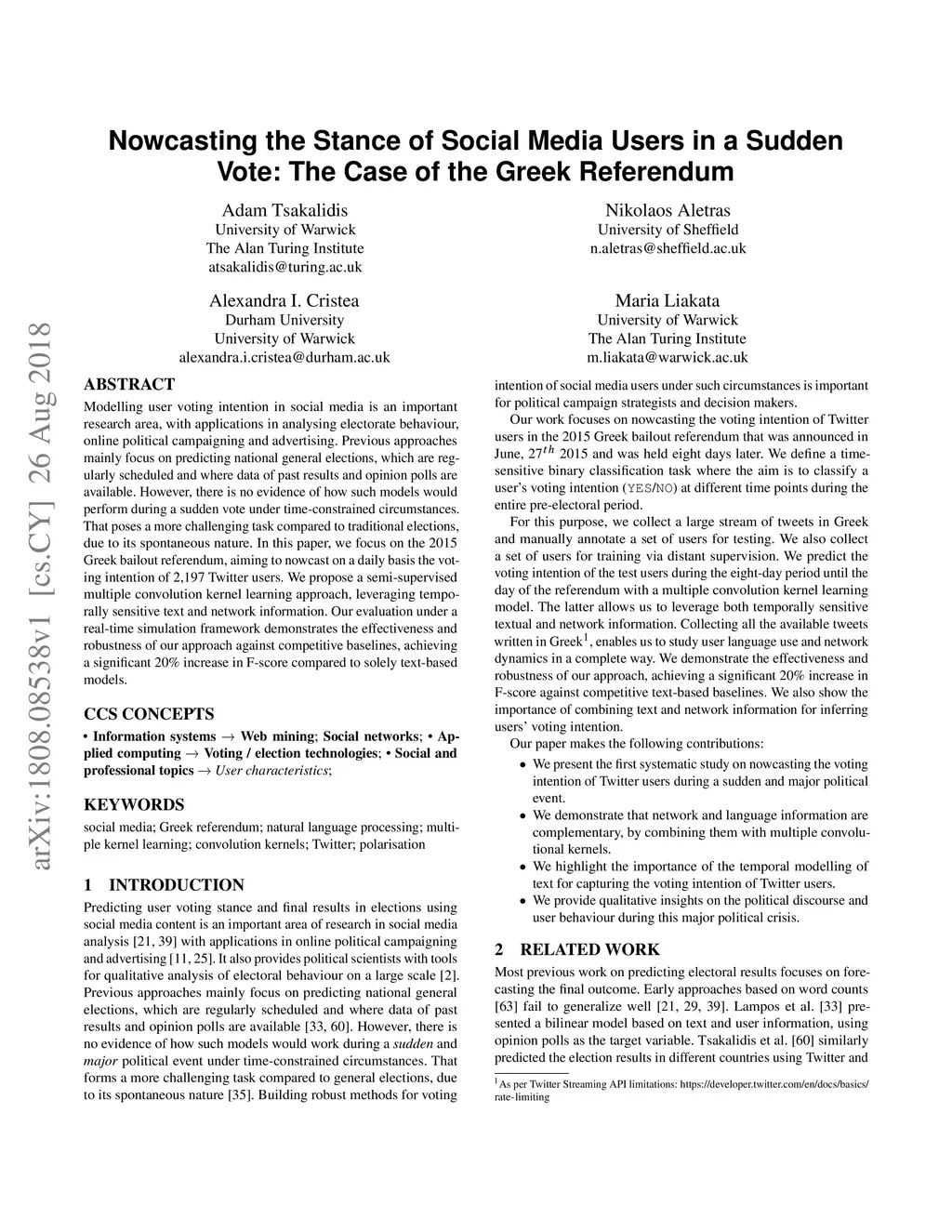 Modelling user voting intention in social media is an important research area, with applications in analysing electorate behaviour, online political campaigning and advertising. Previous approaches mainly focus on predicting national general elections, which are regularly scheduled and where data of past results and opinion polls are available. However, there is no evidence of how such models would perform during a sudden vote under time-constrained circumstances. That poses a more challenging task compared to traditional elections, due to its spontaneous nature. In this paper, we focus on the 2015 Greek bailout referendum, aiming to nowcast on a daily basis the voting intention of 2,197 Twitter users. We propose a semi-supervised multiple convolution kernel learning approach, leveraging temporally sensitive text and network information. Our evaluation under a real-time simulation framework demonstrates the effectiveness and robustness of our approach against competitive baselines, achieving a significant 20% increase in F-score compared to solely text-based models.