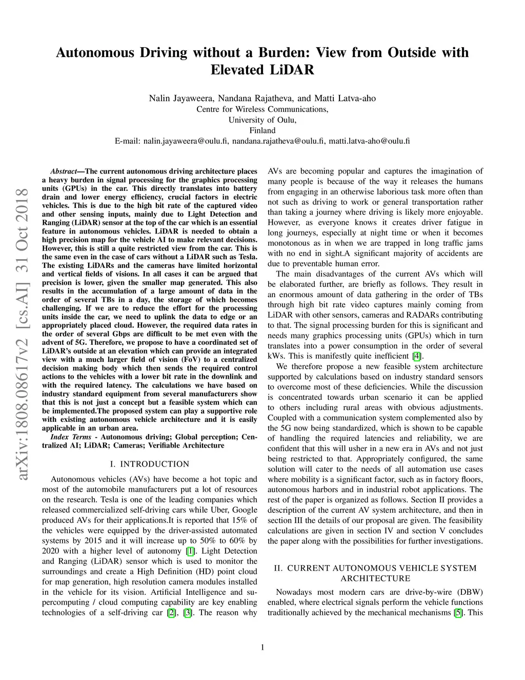 The current autonomous driving architecture places a heavy burden in signal processing for the graphics processing units (GPUs) in the car. This directly translates into battery drain and lower energy efficiency, crucial factors in electric vehicles. This is due to the high bit rate of the captured video and other sensing inputs, mainly due to Light Detection and Ranging (LiDAR) sensor at the top of the car which is an essential feature in autonomous vehicles. LiDAR is needed to obtain a high precision map for the vehicle AI to make relevant decisions. However, this is still a quite restricted view from the car. This is the same even in the case of cars without a LiDAR such as Tesla. The existing LiDARs and the cameras have limited horizontal and vertical fields of visions. In all cases it can be argued that precision is lower, given the smaller map generated. This also results in the accumulation of a large amount of data in the order of several TBs in a day, the storage of which becomes challenging. If we are to reduce the effort for the processing units inside the car, we need to uplink the data to edge or an appropriately placed cloud. However, the required data rates in the order of several Gbps are difficult to be met even with the advent of 5G. Therefore, we propose to have a coordinated set of LiDAR's outside at an elevation which can provide an integrated view with a much larger field of vision (FoV) to a centralized decision making body which then sends the required control actions to the vehicles with a lower bit rate in the downlink and with the required latency. The calculations we have based on industry standard equipment from several manufacturers show that this is not just a concept but a feasible system which can be implemented.The proposed system can play a supportive role with existing autonomous vehicle architecture and it is easily applicable in an urban area.