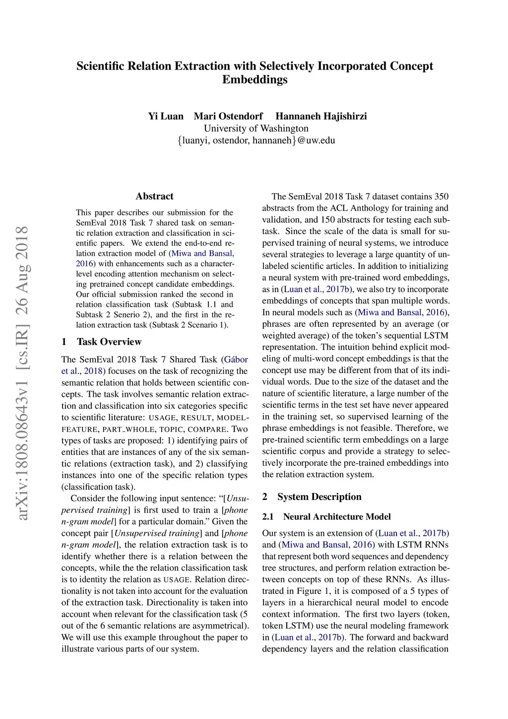 This paper describes our submission for the SemEval 2018 Task 7 shared task on semantic relation extraction and classification in scientific papers. We extend the end-to-end relation extraction model of (Miwa and Bansal) with enhancements such as a character-level encoding attention mechanism on selecting pretrained concept candidate embeddings. Our official submission ranked the second in relation classification task (Subtask 1.1 and Subtask 2 Senerio 2), and the first in the relation extraction task (Subtask 2 Scenario 1).