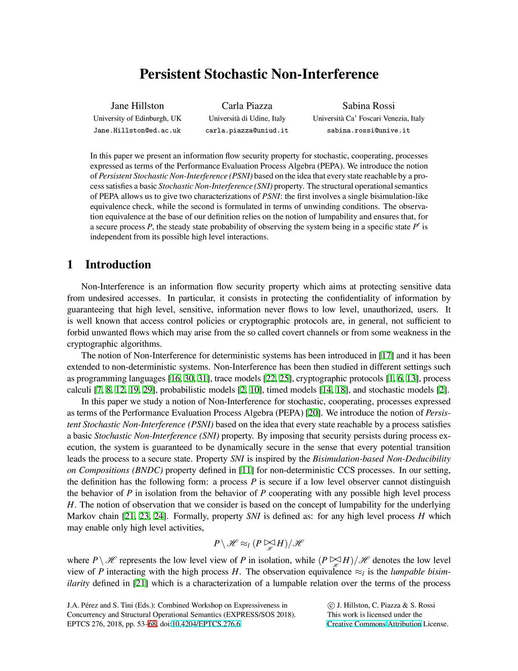 In this paper we present an information flow security property for stochastic, cooperating, processes expressed as terms of the Performance Evaluation Process Algebra (PEPA). We introduce the notion of Persistent Stochastic Non-Interference (PSNI) based on the idea that every state reachable by a process satisfies a basic Stochastic Non-Interference (SNI) property. The structural operational semantics of PEPA allows us to give two characterizations of PSNI: the first involves a single bisimulation-like equivalence check, while the second is formulated in terms of unwinding conditions. The observation equivalence at the base of our definition relies on the notion of lumpability and ensures that, for a secure process P, the steady state probability of observing the system being in a specific state P' is independent from its possible high level interactions.