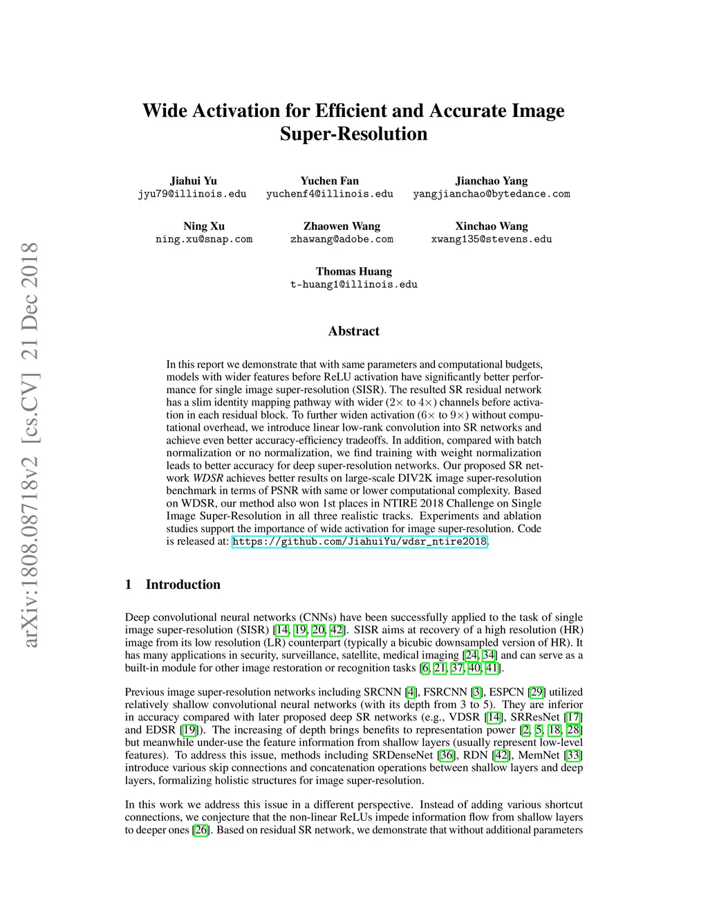 In this report we demonstrate that with same parameters and computational budgets, models with wider features before ReLU activation have significantly better performance for single image super-resolution (SISR). The resulted SR residual network has a slim identity mapping pathway with wider (\(2\times\) to \(4\times\)) channels before activation in each residual block. To further widen activation (\(6\times\) to \(9\times\)) without computational overhead, we introduce linear low-rank convolution into SR networks and achieve even better accuracy-efficiency tradeoffs. In addition, compared with batch normalization or no normalization, we find training with weight normalization leads to better accuracy for deep super-resolution networks. Our proposed SR network \textit{WDSR} achieves better results on large-scale DIV2K image super-resolution benchmark in terms of PSNR with same or lower computational complexity. Based on WDSR, our method also won 1st places in NTIRE 2018 Challenge on Single Image Super-Resolution in all three realistic tracks. Experiments and ablation studies support the importance of wide activation for image super-resolution. Code is released at: https://github.com/JiahuiYu/wdsr_ntire2018