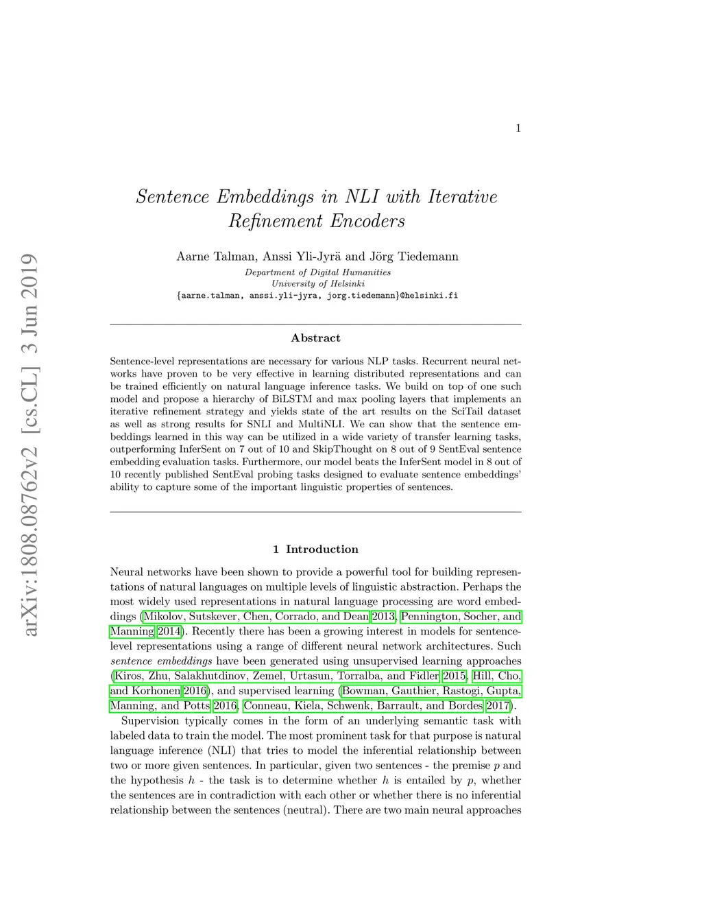 Sentence Embeddings in NLI with Iterative Refinement Encoders