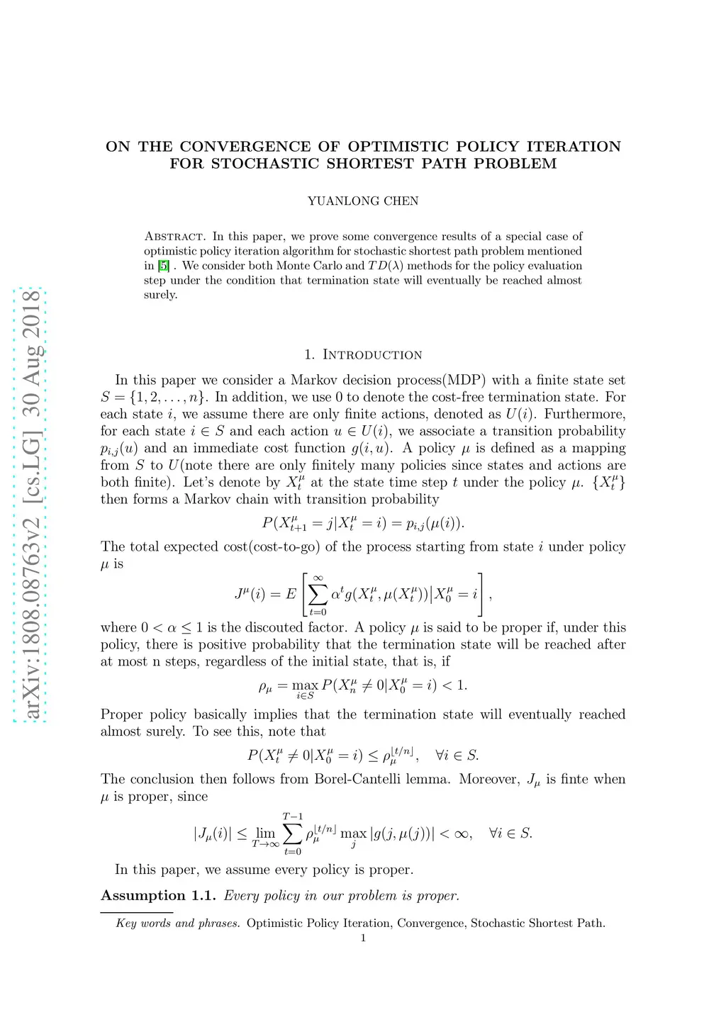 In this paper, we prove some convergence results of a special case of optimistic policy iteration algorithm for stochastic shortest path problem. We consider both Monte Carlo and methods for the policy evaluation step under the condition that the termination state will eventually be reached almost surely.
