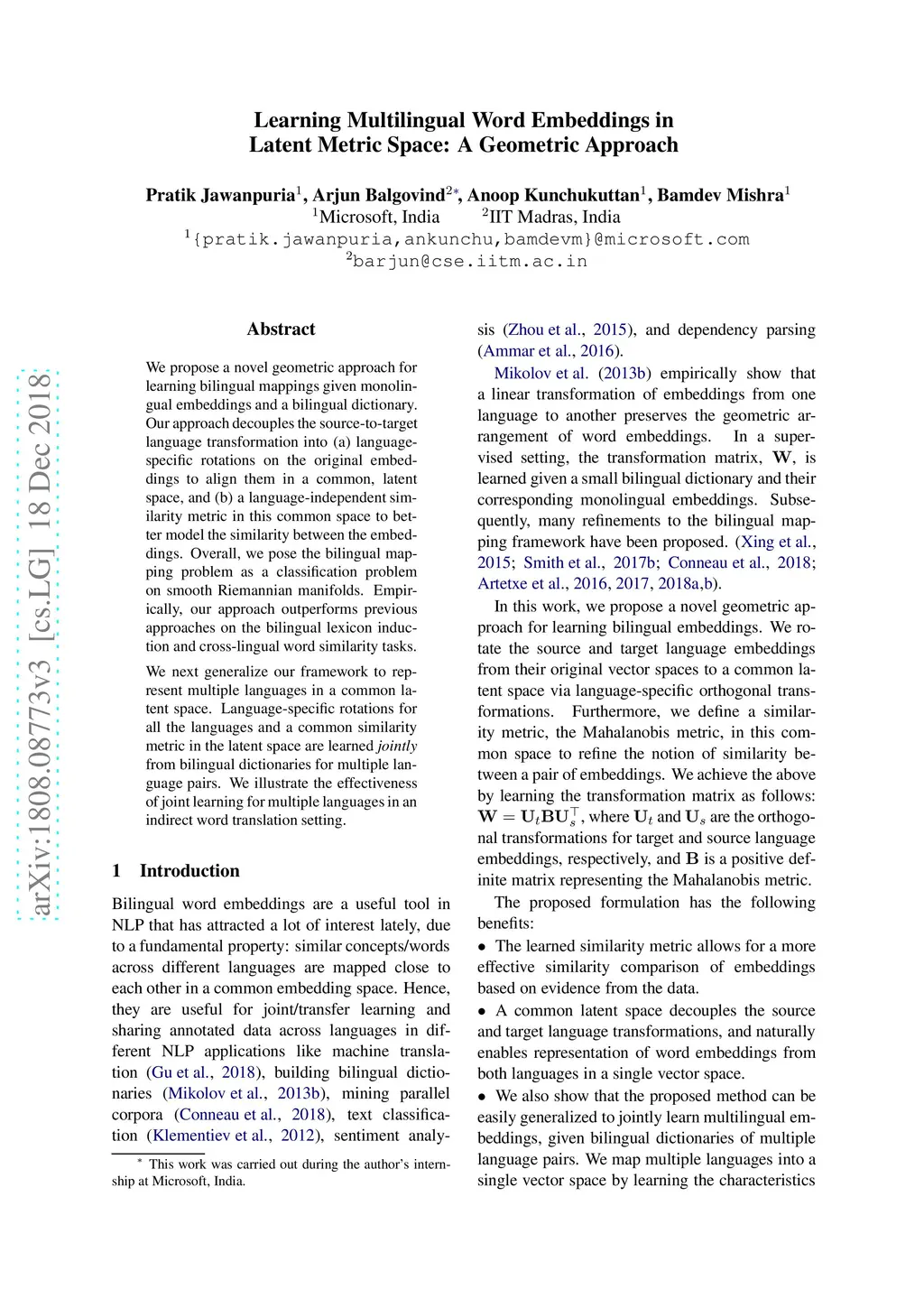 We propose a novel geometric approach for learning bilingual mappings given monolingual embeddings and a bilingual dictionary. Our approach decouples learning the transformation from the source language to the target language into (a) learning rotations for language-specific embeddings to align them to a common space, and (b) learning a similarity metric in the common space to model similarities between the embeddings. We model the bilingual mapping problem as an optimization problem on smooth Riemannian manifolds. We show that our approach outperforms previous approaches on the bilingual lexicon induction and cross-lingual word similarity tasks. We also generalize our framework to represent multiple languages in a common latent space. In particular, the latent space representations for several languages are learned jointly, given bilingual dictionaries for multiple language pairs. We illustrate the effectiveness of joint learning for multiple languages in zero-shot word translation setting. Our implementation is available at https://github.com/anoopkunchukuttan/geomm .