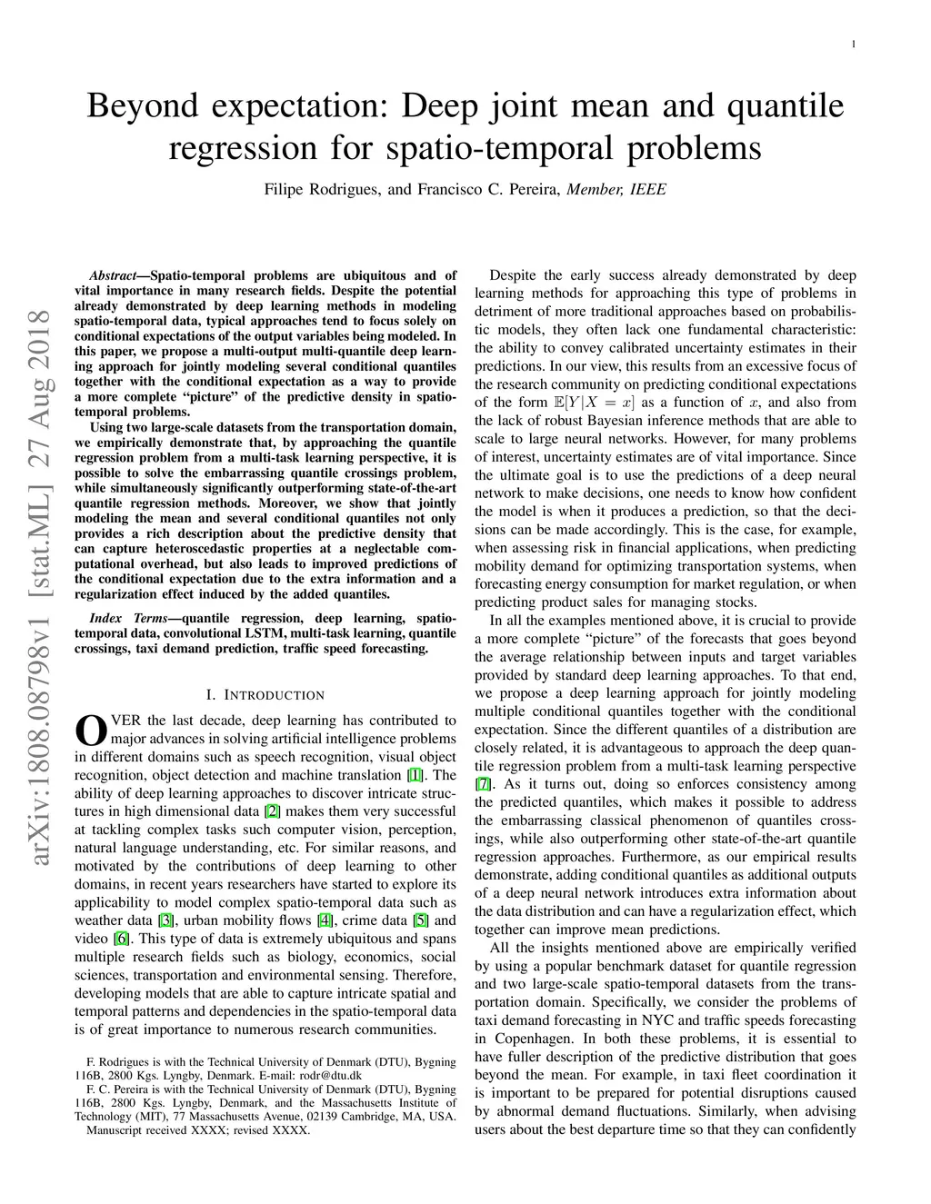 Spatio-temporal problems are ubiquitous and of vital importance in many research fields. Despite the potential already demonstrated by deep learning methods in modeling spatio-temporal data, typical approaches tend to focus solely on conditional expectations of the output variables being modeled. In this paper, we propose a multi-output multi-quantile deep learning approach for jointly modeling several conditional quantiles together with the conditional expectation as a way to provide a more complete "picture" of the predictive density in spatio-temporal problems. Using two large-scale datasets from the transportation domain, we empirically demonstrate that, by approaching the quantile regression problem from a multi-task learning perspective, it is possible to solve the embarrassing quantile crossings problem, while simultaneously significantly outperforming state-of-the-art quantile regression methods. Moreover, we show that jointly modeling the mean and several conditional quantiles not only provides a rich description about the predictive density that can capture heteroscedastic properties at a neglectable computational overhead, but also leads to improved predictions of the conditional expectation due to the extra information and a regularization effect induced by the added quantiles.
