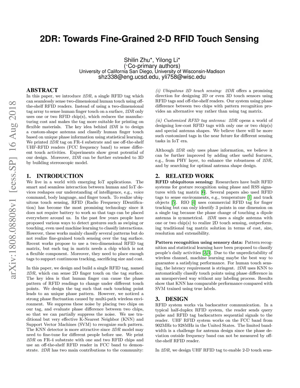 In this paper, we introduce 2DR, a single RFID tag which can seamlessly sense two-dimensional human touch using off-the-shelf RFID readers. Instead of using a two-dimensional tag array to sense human finger touch on a surface, 2DR only uses one or two RFID chip(s), which reduces the manufacturing cost and makes the tag more suitable for printing on flexible materials. The key idea behind 2DR is to design a custom-shape antenna and classify human finger touch based on unique phase information using statistical learning. We printed 2DR tag on FR-4 substrate and use off-the-shelf UHF-RFID readers (FCC frequency band) to sense different touch activities. Experiments show great potential of our design. Moreover, 2DR can be further extended to 3D by building stereoscopic model.