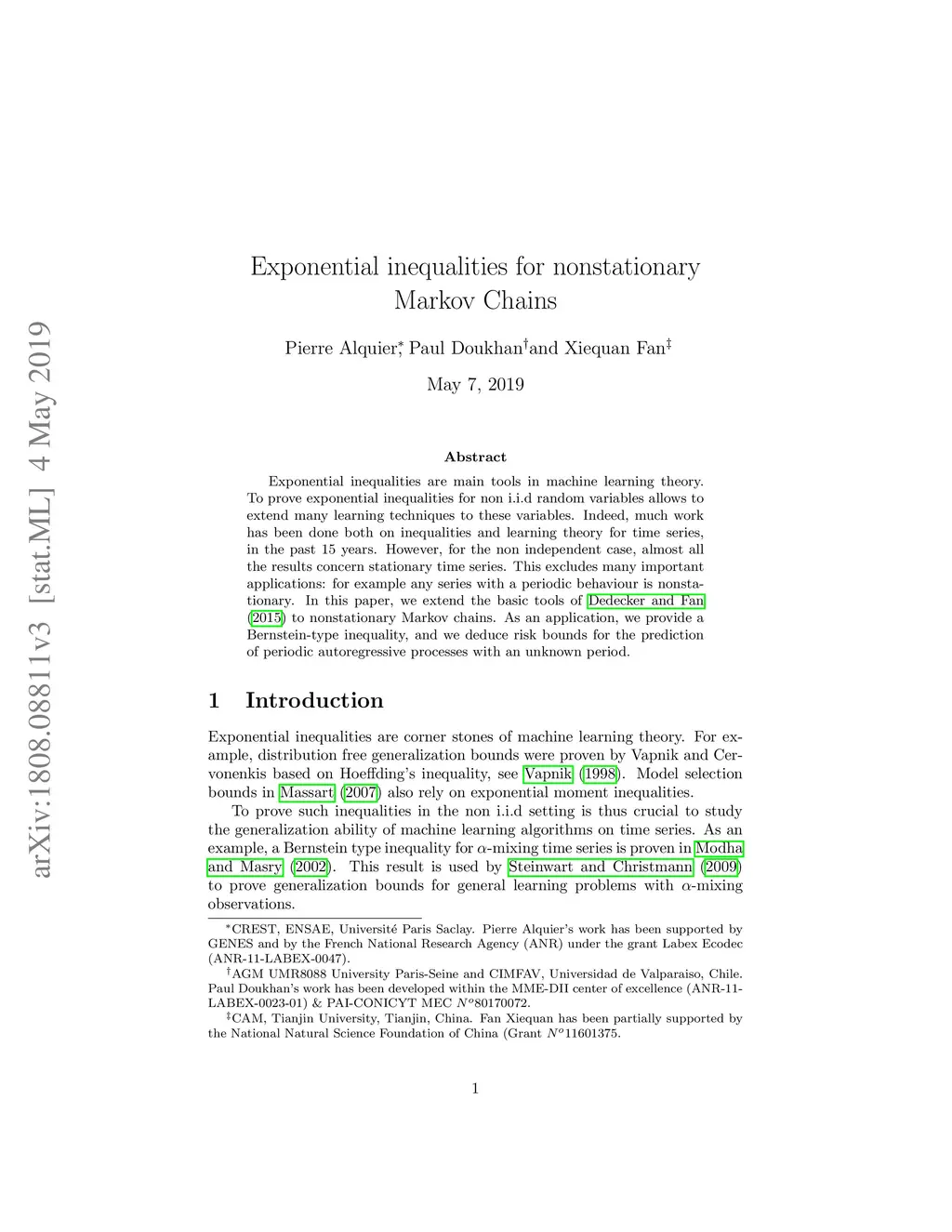 Exponential inequalities are main tools in machine learning theory. To prove exponential inequalities for non i.i.d random variables allows to extend many learning techniques to these variables. Indeed, much work has been done both on inequalities and learning theory for time series, in the past 15 years. However, for the non independent case, almost all the results concern stationary time series. This excludes many important applications: for example any series with a periodic behaviour is non-stationary. In this paper, we extend the basic tools of Dedecker and Fan (2015) to nonstationary Markov chains. As an application, we provide a Bernstein-type inequality, and we deduce risk bounds for the prediction of periodic autoregressive processes with an unknown period.