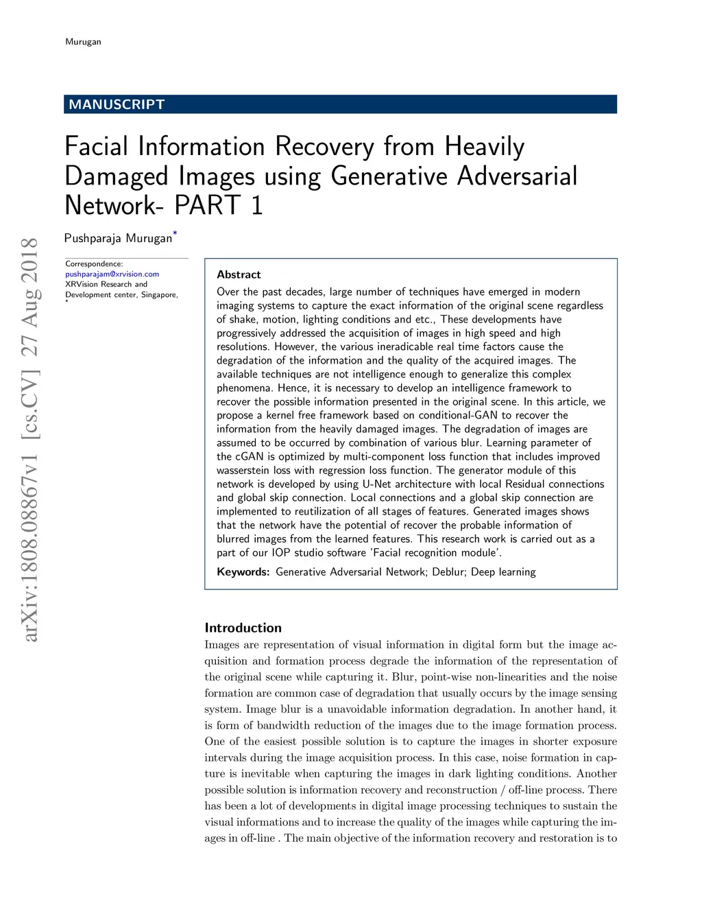 Over the past decades, a large number of techniques have emerged in modern imaging systems to capture the exact information of the original scene regardless of shake, motion, lighting conditions and etc., These developments have progressively addressed the acquisition of images in high speed and high resolutions. However, the various ineradicable real-time factors cause the degradation of the information and the quality of the acquired images. The available techniques are not intelligent enough to generalize this complex phenomenon. Hence, it is necessary to develop an intellectual framework to recover the possible information presented in the original scene. In this article, we propose a kernel free framework based on conditional-GAN to recover the information from the heavily damaged images. The degradation of images is assumed to be occurred by the combination of a various blur. Learning parameter of the cGAN is optimized by multi-component loss function that includes improved wasserstein loss with regression loss function. The generator module of this network is developed by using U-Net architecture with local Residual connections and global skip connection. Local connections and a global skip connection are implemented for the utilization of all stages of features. Generated images show that the network has the potential to recover the probable information of blurred images from the learned features. This research work is carried out as a part of our IOP studio software 'Facial recognition module'.
