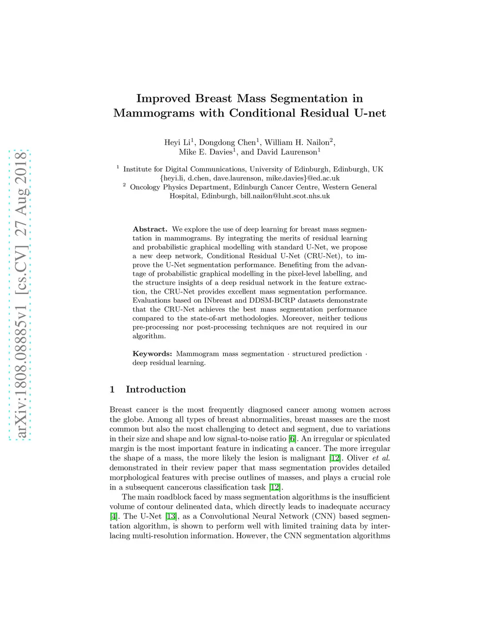 We explore the use of deep learning for breast mass segmentation in mammograms. By integrating the merits of residual learning and probabilistic graphical modelling with standard U-Net, we propose a new deep network, Conditional Residual U-Net (CRU-Net), to improve the U-Net segmentation performance. Benefiting from the advantage of probabilistic graphical modelling in the pixel-level labelling, and the structure insights of a deep residual network in the feature extraction, the CRU-Net provides excellent mass segmentation performance. Evaluations based on INbreast and DDSM-BCRP datasets demonstrate that the CRU-Net achieves the best mass segmentation performance compared to the state-of-art methodologies. Moreover, neither tedious pre-processing nor post-processing techniques are not required in our algorithm.
