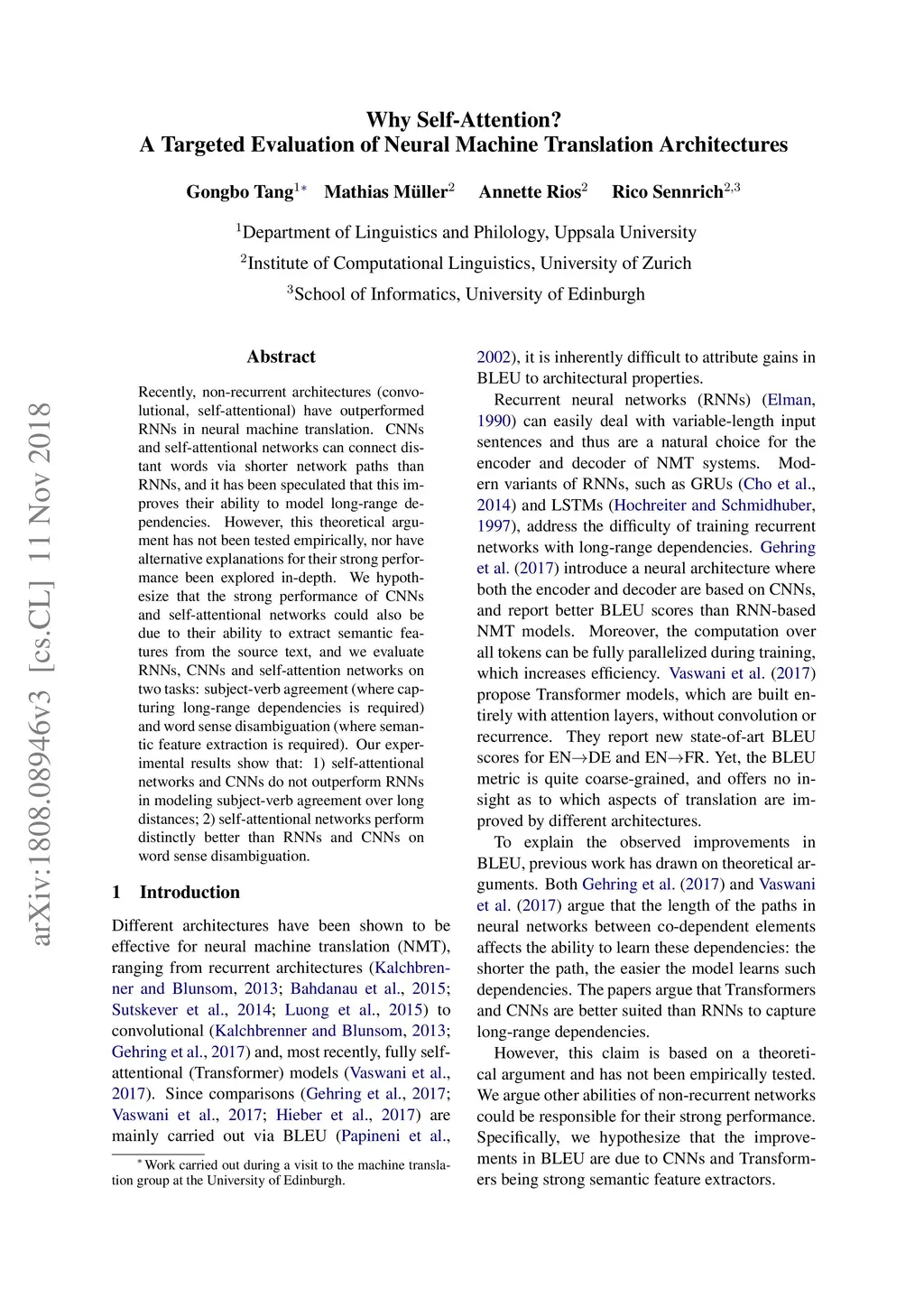 Why Self-Attention? A Targeted Evaluation of Neural Machine Translation