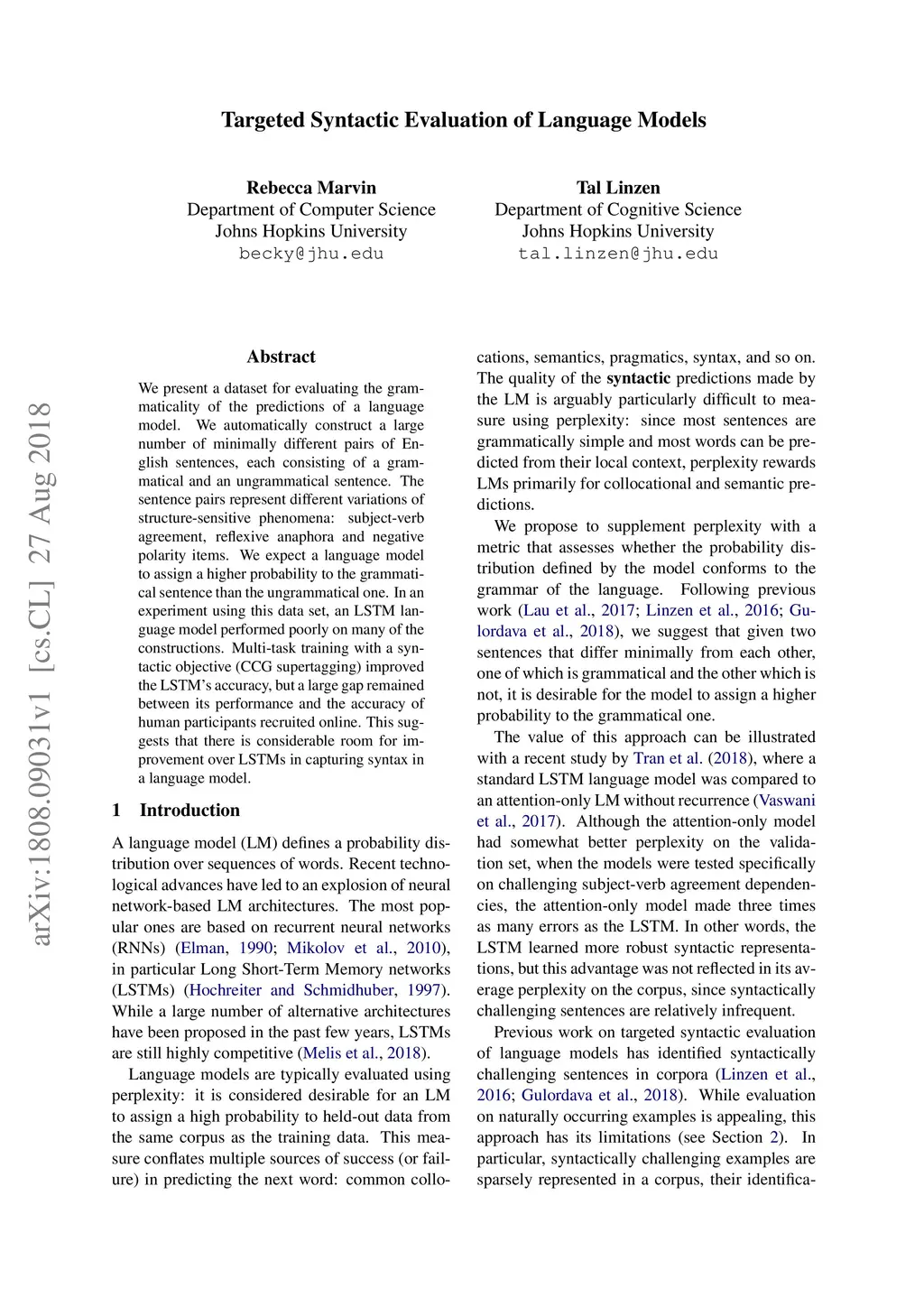 We present a dataset for evaluating the grammaticality of the predictions of a language model. We automatically construct a large number of minimally different pairs of English sentences, each consisting of a grammatical and an ungrammatical sentence. The sentence pairs represent different variations of structure-sensitive phenomena: subject-verb agreement, reflexive anaphora and negative polarity items. We expect a language model to assign a higher probability to the grammatical sentence than the ungrammatical one. In an experiment using this data set, an LSTM language model performed poorly on many of the constructions. Multi-task training with a syntactic objective (CCG supertagging) improved the LSTM's accuracy, but a large gap remained between its performance and the accuracy of human participants recruited online. This suggests that there is considerable room for improvement over LSTMs in capturing syntax in a language model.