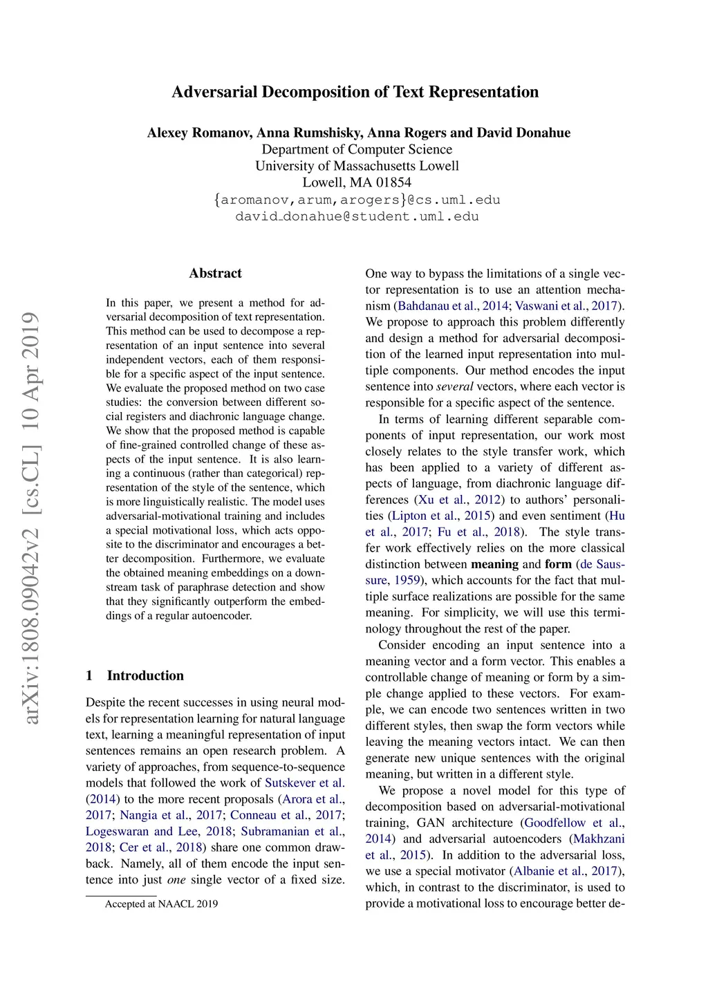 In this paper, we present a method for adversarial decomposition of text representation. This method can be used to decompose a representation of an input sentence into several independent vectors, each of them responsible for a specific aspect of the input sentence. We evaluate the proposed method on two case studies: the conversion between different social registers and diachronic language change. We show that the proposed method is capable of fine-grained controlled change of these aspects of the input sentence. It is also learning a continuous (rather than categorical) representation of the style of the sentence, which is more linguistically realistic. The model uses adversarial-motivational training and includes a special motivational loss, which acts opposite to the discriminator and encourages a better decomposition. Furthermore, we evaluate the obtained meaning embeddings on a downstream task of paraphrase detection and show that they significantly outperform the embeddings of a regular autoencoder.