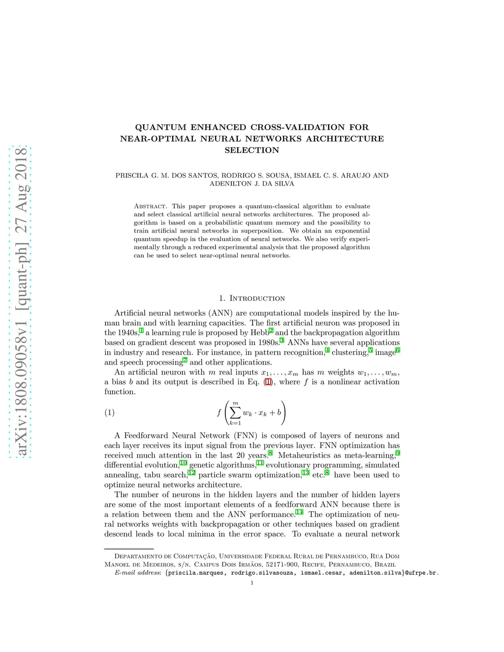 This paper proposes a quantum-classical algorithm to evaluate and select classical artificial neural networks architectures. The proposed algorithm is based on a probabilistic quantum memory and the possibility to train artificial neural networks in superposition. We obtain an exponential quantum speedup in the evaluation of neural networks. We also verify experimentally through a reduced experimental analysis that the proposed algorithm can be used to select near-optimal neural networks.