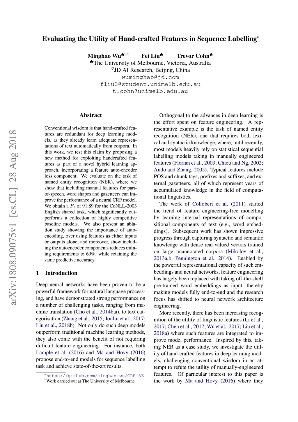 Conventional wisdom is that hand-crafted features are redundant for deep learning models, as they already learn adequate representations of text automatically from corpora. In this work, we test this claim by proposing a new method for exploiting handcrafted features as part of a novel hybrid learning approach, incorporating a feature auto-encoder loss component. We evaluate on the task of named entity recognition (NER), where we show that including manual features for part-of-speech, word shapes and gazetteers can improve the performance of a neural CRF model. We obtain a of 91.89 for the CoNLL-2003 English shared task, which significantly outperforms a collection of highly competitive baseline models. We also present an ablation study showing the importance of auto-encoding, over using features as either inputs or outputs alone, and moreover, show including the autoencoder components reduces training requirements to 60\%, while retaining the same predictive accuracy.