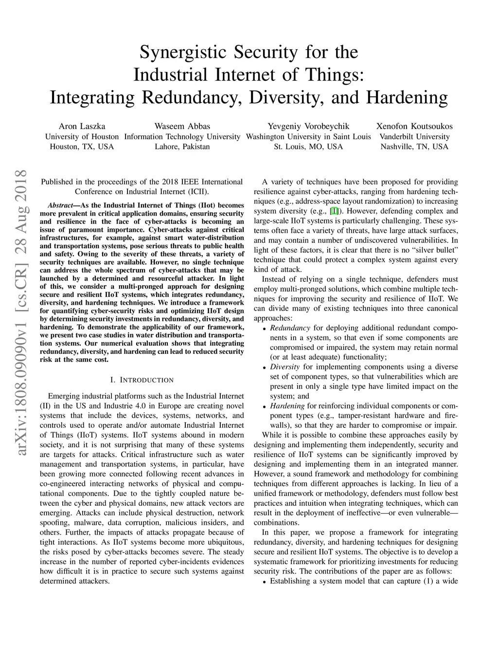 As the Industrial Internet of Things (IIot) becomes more prevalent in critical application domains, ensuring security and resilience in the face of cyber-attacks is becoming an issue of paramount importance. Cyber-attacks against critical infrastructures, for example, against smart water-distribution and transportation systems, pose serious threats to public health and safety. Owing to the severity of these threats, a variety of security techniques are available. However, no single technique can address the whole spectrum of cyber-attacks that may be launched by a determined and resourceful attacker. In light of this, we consider a multi-pronged approach for designing secure and resilient IIoT systems, which integrates redundancy, diversity, and hardening techniques. We introduce a framework for quantifying cyber-security risks and optimizing IIoT design by determining security investments in redundancy, diversity, and hardening. To demonstrate the applicability of our framework, we present two case studies in water distribution and transportation a case study in water-distribution systems. Our numerical evaluation shows that integrating redundancy, diversity, and hardening can lead to reduced security risk at the same cost.