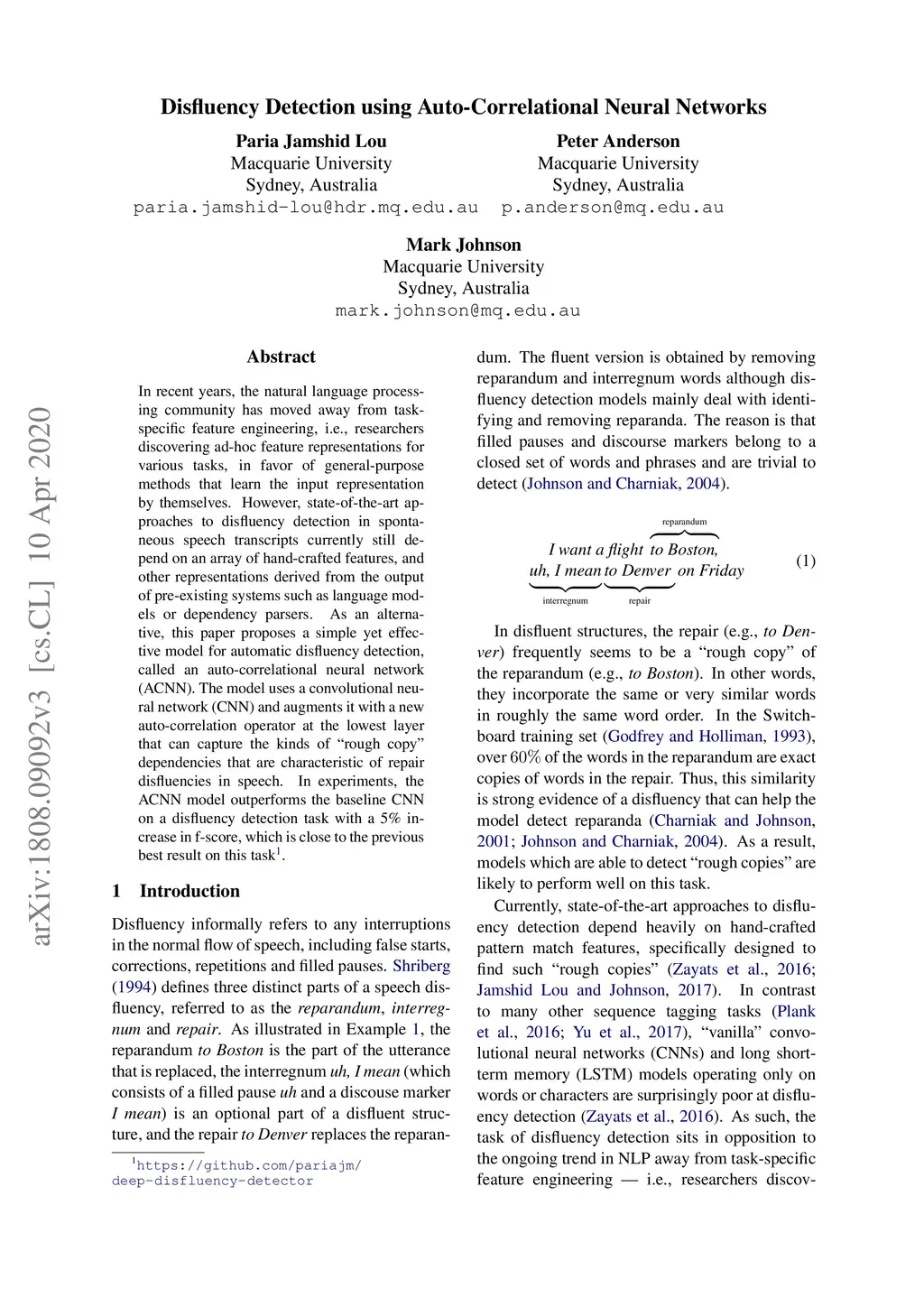 Disfluency Detection using Auto-Correlational Neural Networks
