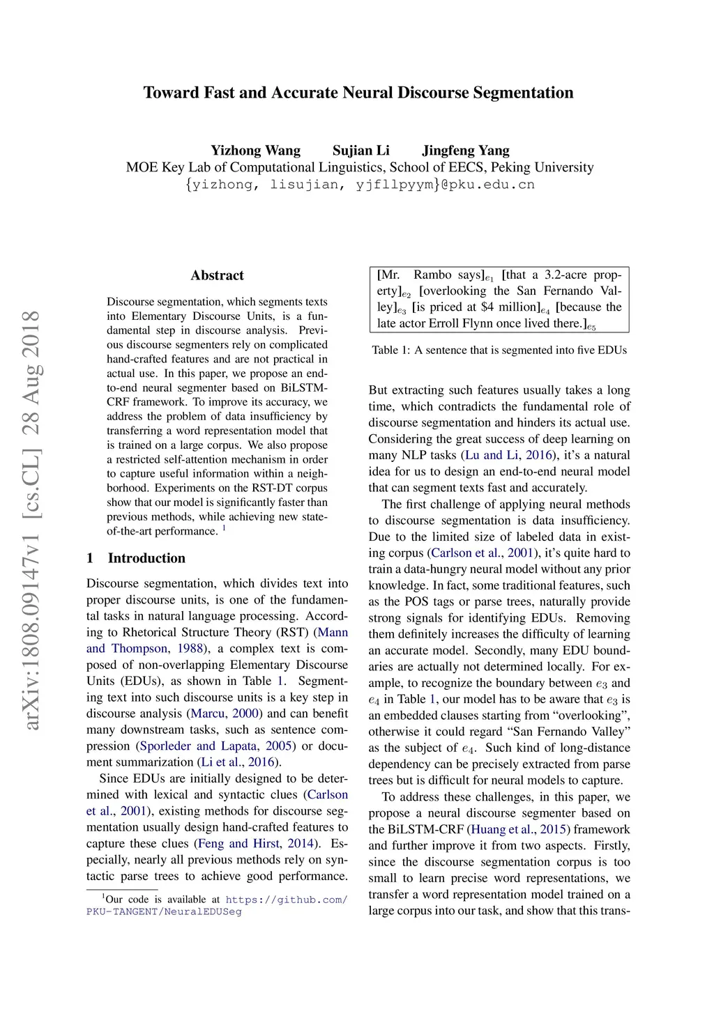 Toward Fast and Accurate Neural Discourse Segmentation