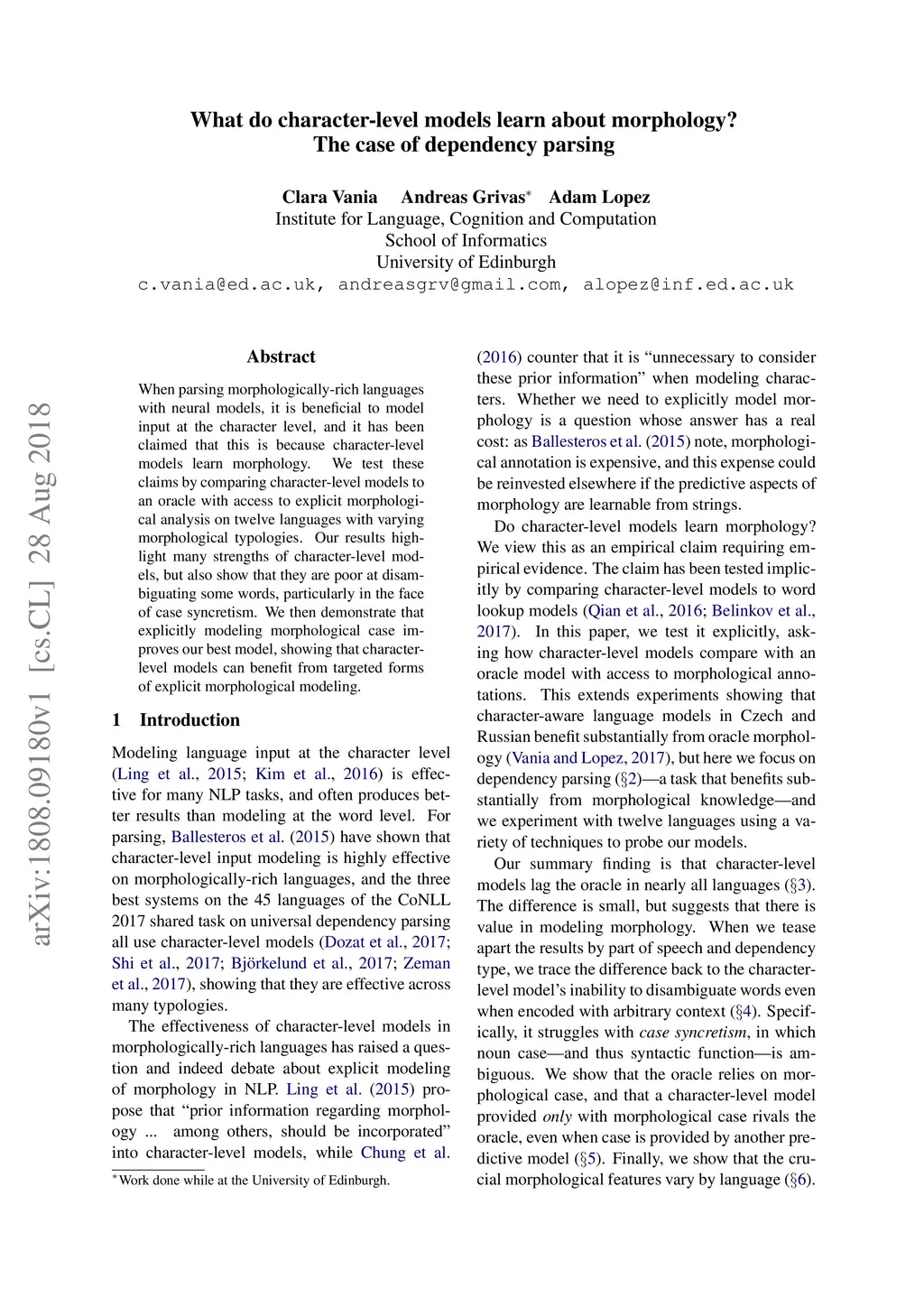 When parsing morphologically-rich languages with neural models, it is beneficial to model input at the character level, and it has been claimed that this is because character-level models learn morphology. We test these claims by comparing character-level models to an oracle with access to explicit morphological analysis on twelve languages with varying morphological typologies. Our results highlight many strengths of character-level models, but also show that they are poor at disambiguating some words, particularly in the face of case syncretism. We then demonstrate that explicitly modeling morphological case improves our best model, showing that character-level models can benefit from targeted forms of explicit morphological modeling.