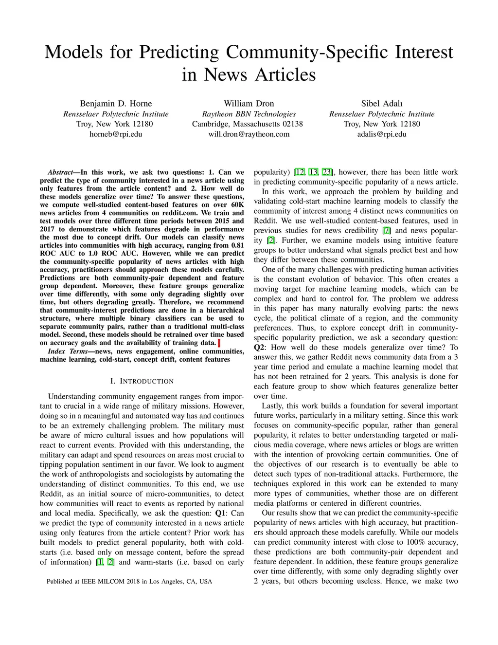 In this work, we ask two questions: 1. Can we predict the type of community interested in a news article using only features from the article content? and 2. How well do these models generalize over time? To answer these questions, we compute well-studied content-based features on over 60K news articles from 4 communities on reddit.com. We train and test models over three different time periods between 2015 and 2017 to demonstrate which features degrade in performance the most due to concept drift. Our models can classify news articles into communities with high accuracy, ranging from 0.81 ROC AUC to 1.0 ROC AUC. However, while we can predict the community-specific popularity of news articles with high accuracy, practitioners should approach these models carefully. Predictions are both community-pair dependent and feature group dependent. Moreover, these feature groups generalize over time differently, with some only degrading slightly over time, but others degrading greatly. Therefore, we recommend that community-interest predictions are done in a hierarchical structure, where multiple binary classifiers can be used to separate community pairs, rather than a traditional multi-class model. Second, these models should be retrained over time based on accuracy goals and the availability of training data.