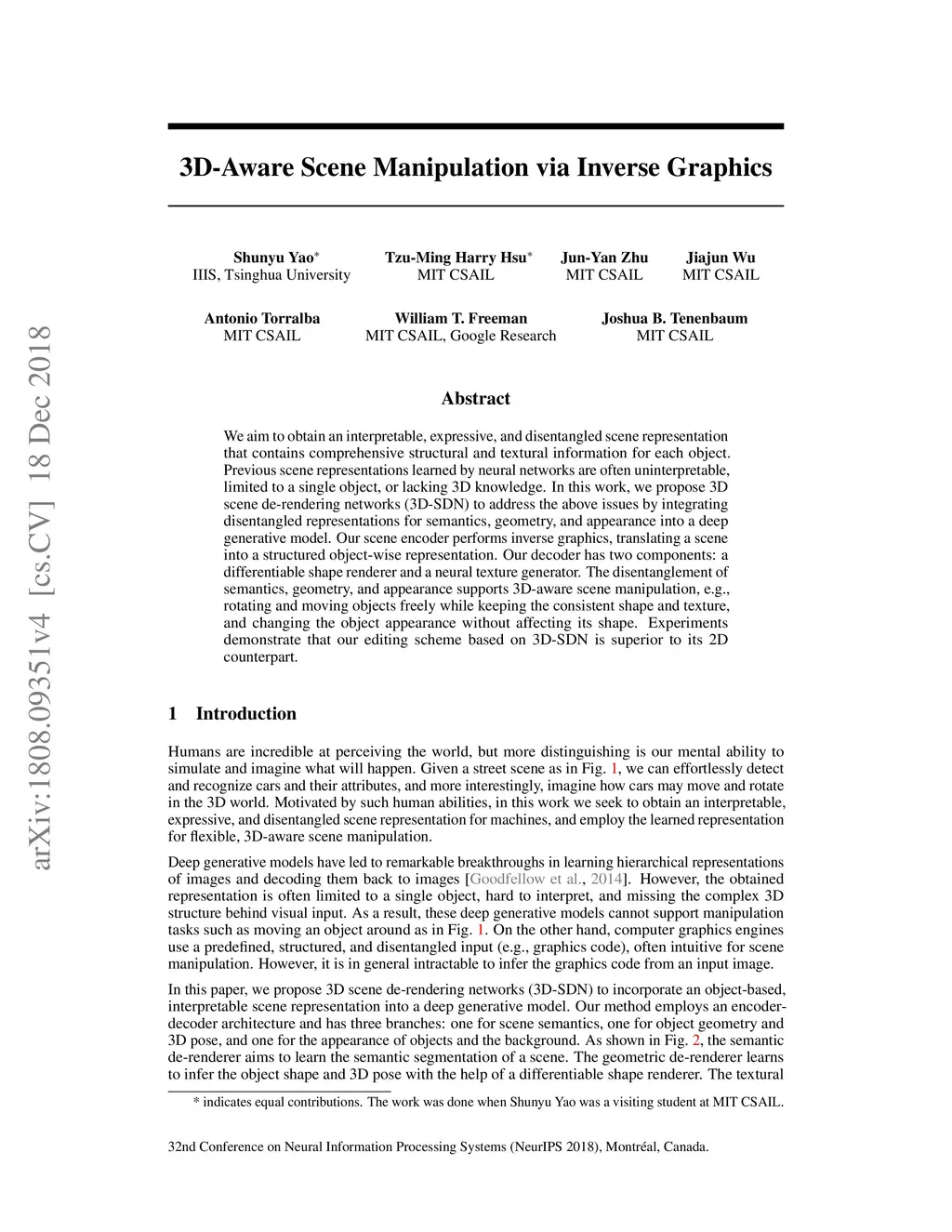 We aim to obtain an interpretable, expressive, and disentangled scene representation that contains comprehensive structural and textural information for each object. Previous scene representations learned by neural networks are often uninterpretable, limited to a single object, or lacking 3D knowledge. In this work, we propose 3D scene de-rendering networks (3D-SDN) to address the above issues by integrating disentangled representations for semantics, geometry, and appearance into a deep generative model. Our scene encoder performs inverse graphics, translating a scene into a structured object-wise representation. Our decoder has two components: a differentiable shape renderer and a neural texture generator. The disentanglement of semantics, geometry, and appearance supports 3D-aware scene manipulation, e.g., rotating and moving objects freely while keeping the consistent shape and texture, and changing the object appearance without affecting its shape. Experiments demonstrate that our editing scheme based on 3D-SDN is superior to its 2D counterpart.